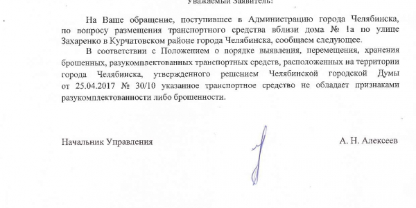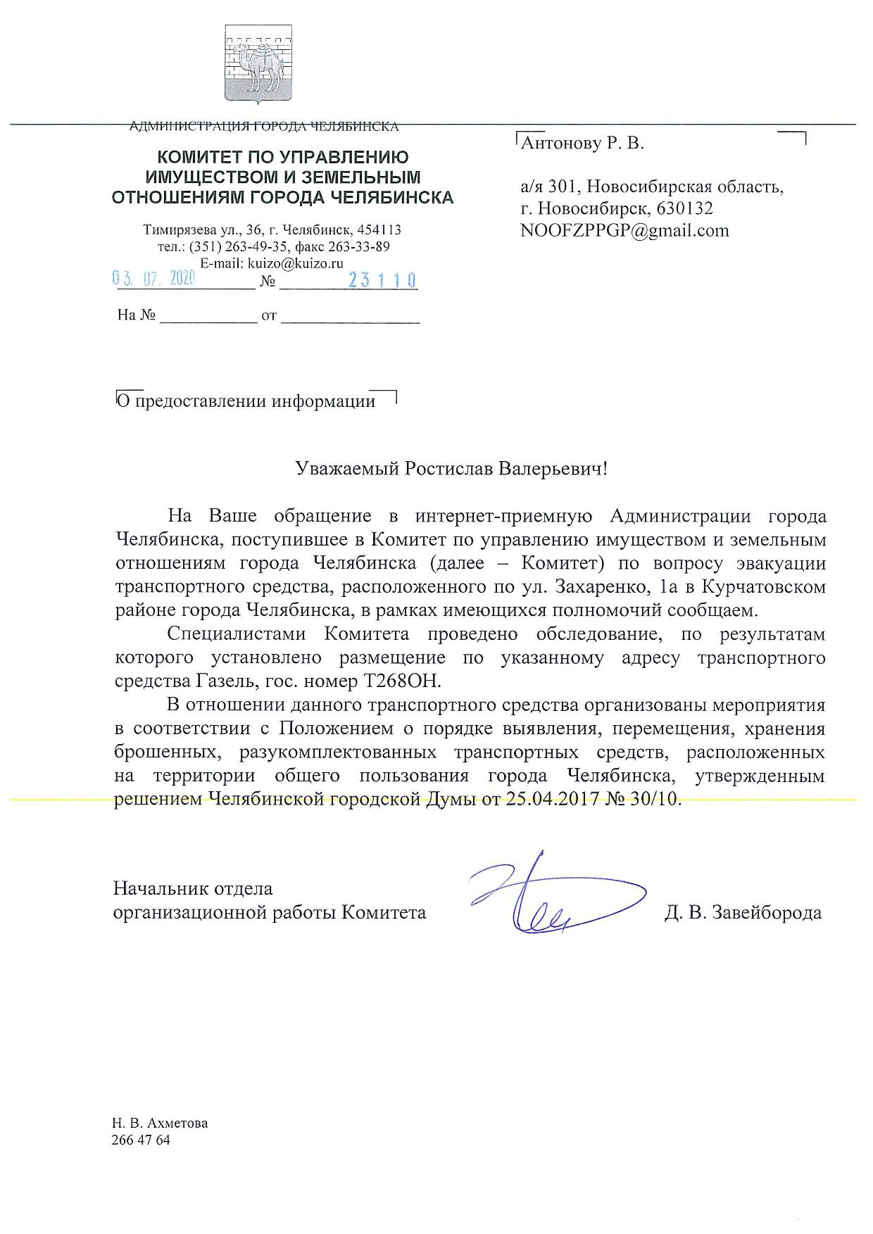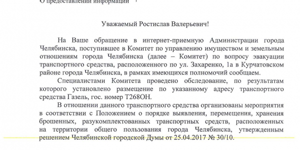 Номер жалобы:66452 Тип жалобы:Прочее Название объекта: Регион:Челябинская область Город:Челябинск Адрес:улица Захаренко, 1А Описание жалобы:Более одного года на газоне у дома Захаренко 1а стоит газель с номером т268он. Необходим ее демонтаж. Статус: