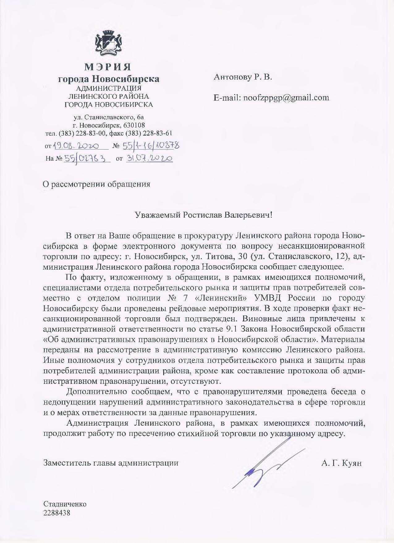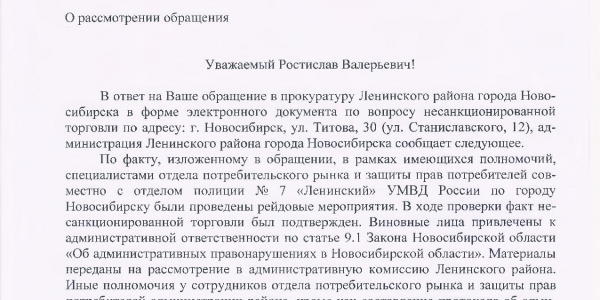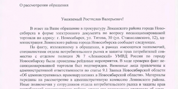 Номер жалобы:66460 Тип жалобы:Прочее Название объекта: Регион:Новосибирская область Город:Новосибирск Адрес:улица Титова, 30 Описание жалобы:Повторное обращение. Независимо от предупреждений, снова те же торговцы на улице продают овощи, фрукты Статус: