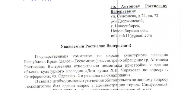 В связи с нарушением сроков ответа, прошу перенаправить в прокуратуру обращение о ненадлежащем содержании памятника архитектуры, здания по адресу г. Симферополь, Одесская 2 Статус: