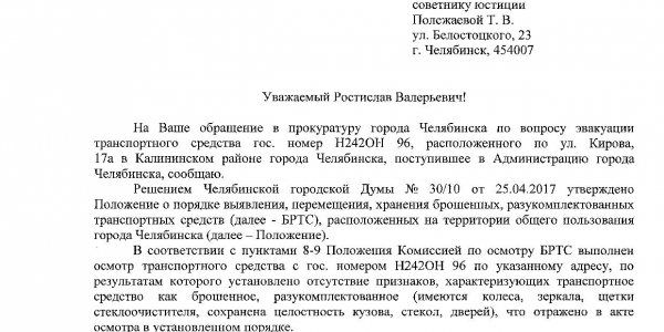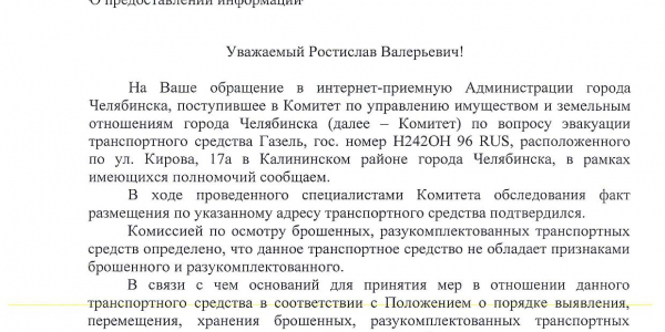 Номер жалобы:66453 Тип жалобы:Прочее Название объекта: Регион:Челябинская область Город:Челябинск Адрес:улица Кирова, 17А Описание жалобы:Более года на газоне у дома Кирова 17а стоит брошенная газель с номером н242он. Необходим ее демонтаж. Статус: