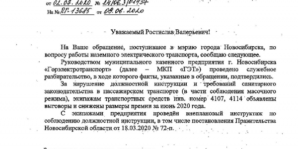 Номер жалобы:66461 Тип жалобы:Прочее Название объекта: Регион:Новосибирская область Город:Новосибирск Адрес:проезд Энергетиков, 4А Описание жалобы:Провоз пассажиров без маски, с пивом. Распитие алкоголя пассажирами в троллейбусе. Машина 4114. 24 маршрут. После пересадки в другую машину, 4107 кондуктор не проконтролировала посадку пассажиров. Пассажир зашёл без маски, и пил пиво. Статус: