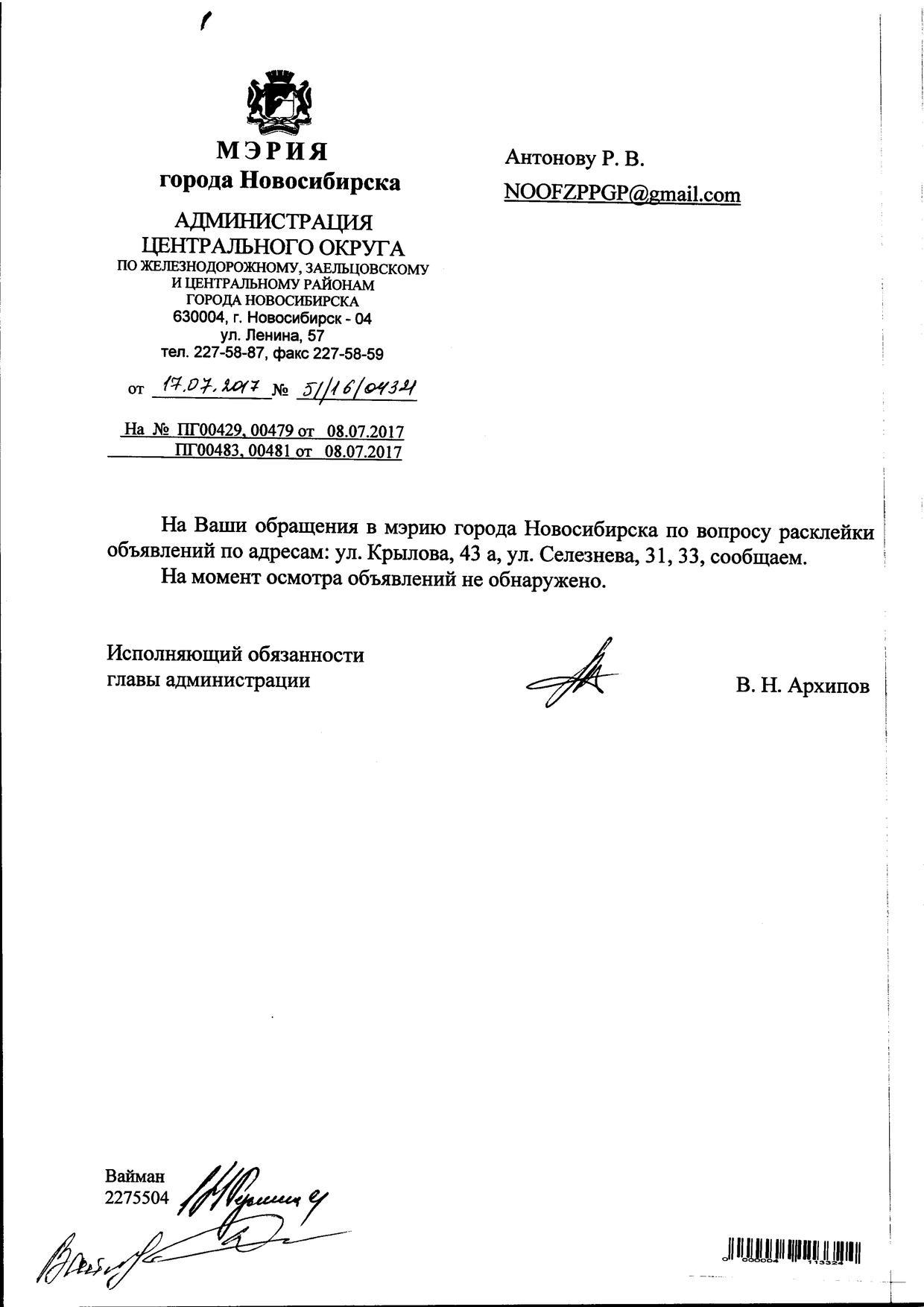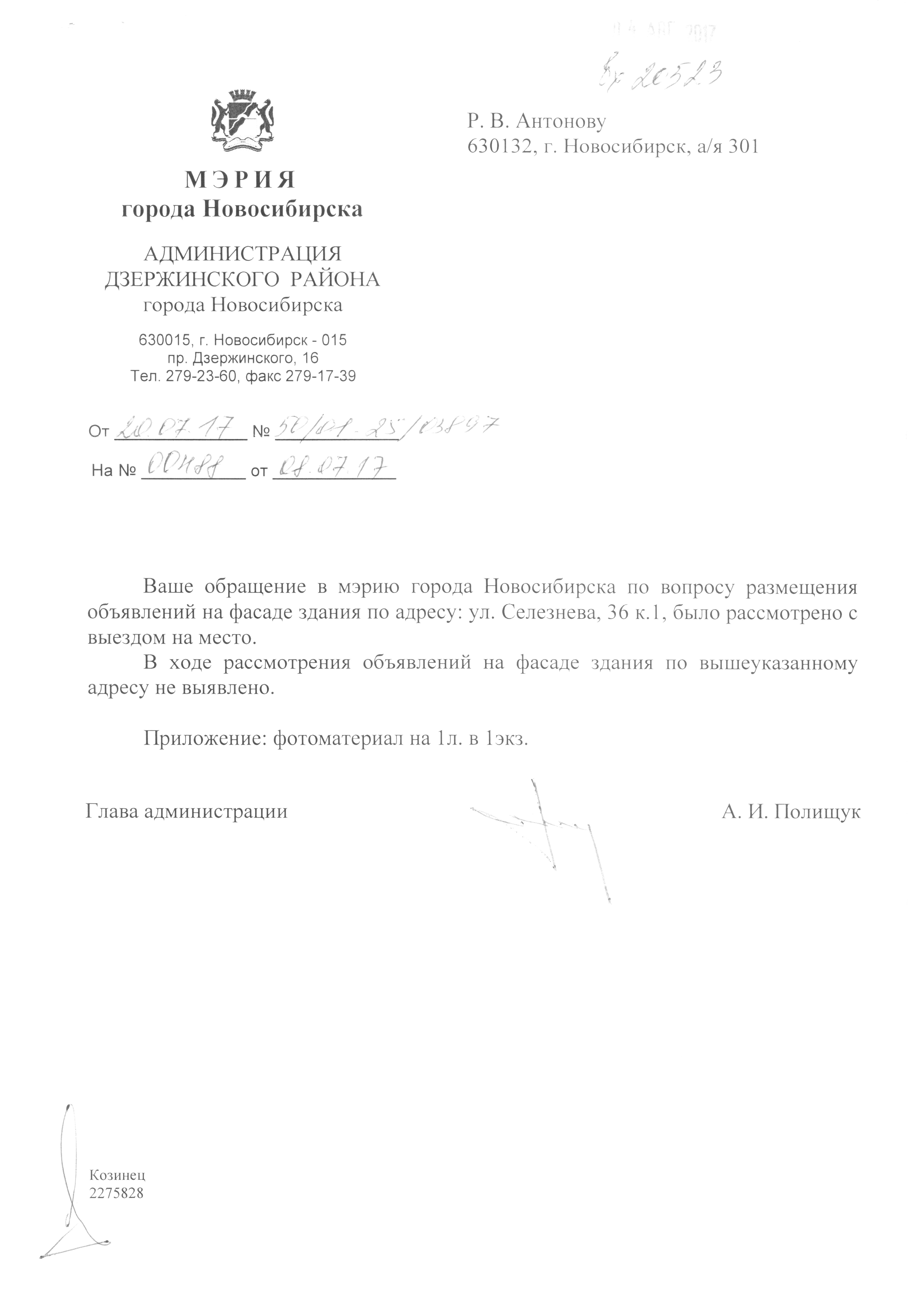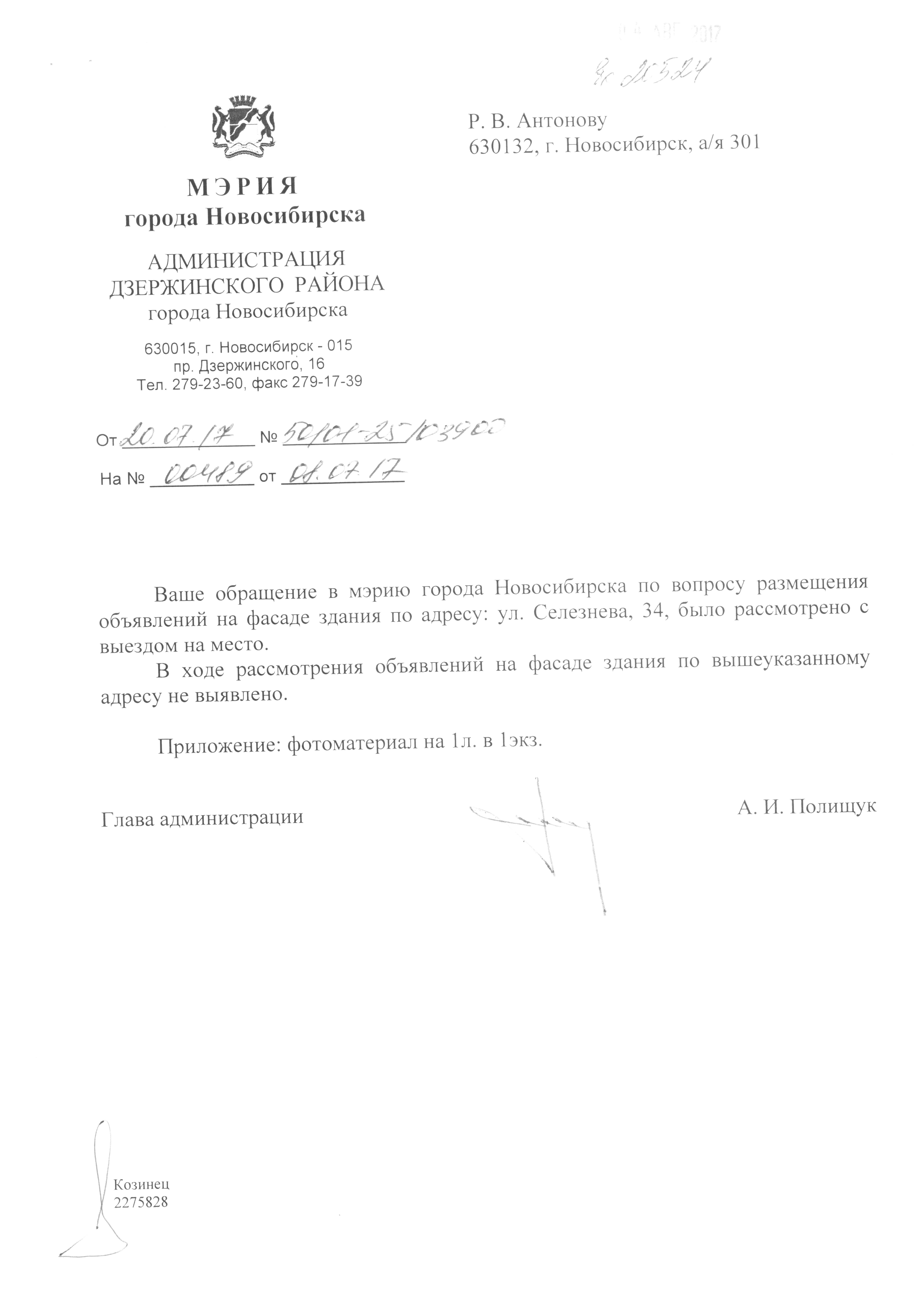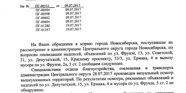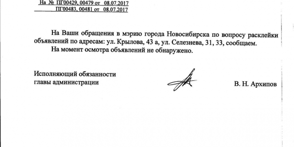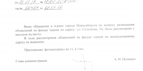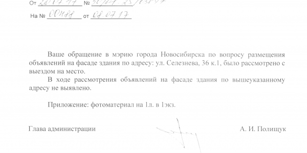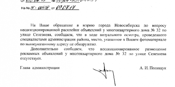 Номер жалобы:20519 Тип жалобы:Иные проблемы ЖКХ Название объекта:Администрация Регион:Новосибирская область Город:Новосибирск Адрес:ул. Селезнева, 31 Описание жалобы:Объявление на столбе Статус:
