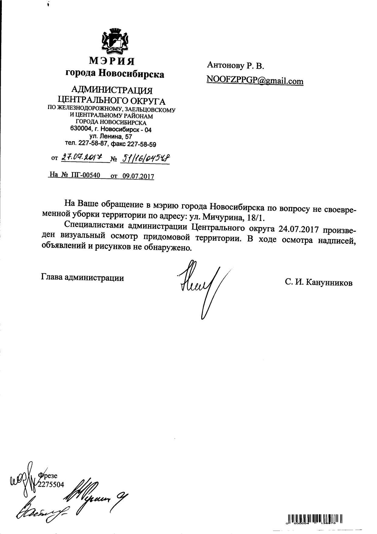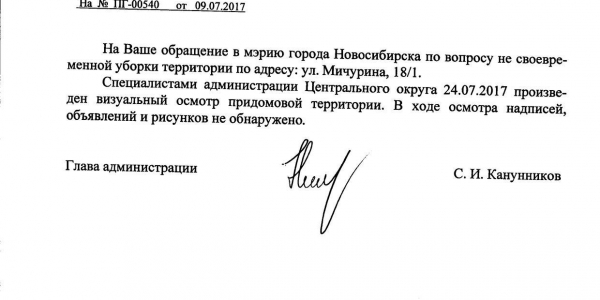Номер жалобы:20527 Тип жалобы:Иные проблемы ЖКХ Название объекта:Управляющая Компания Регион:Новосибирская область Город:Новосибирск Адрес:ул. Мичурина, 18/1 Описание жалобы:Надписи на фасаде дома Статус: