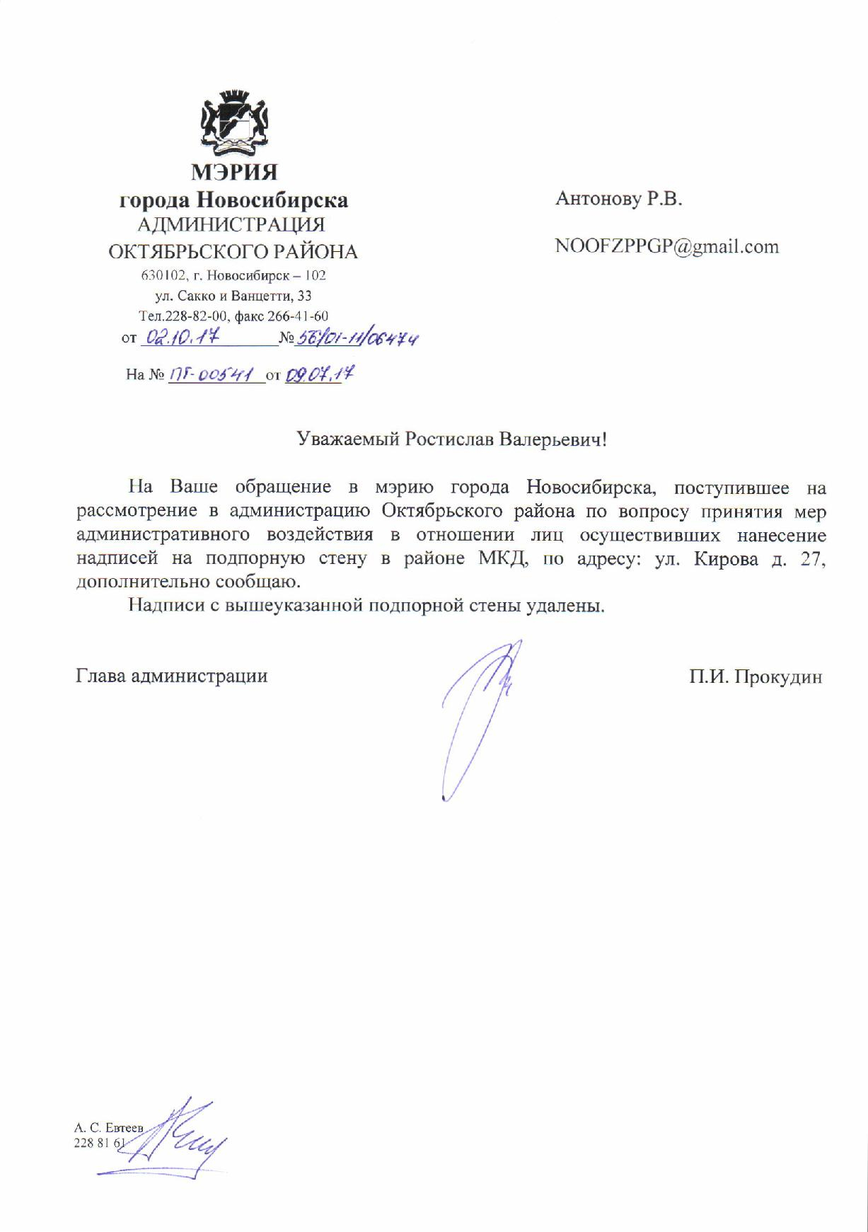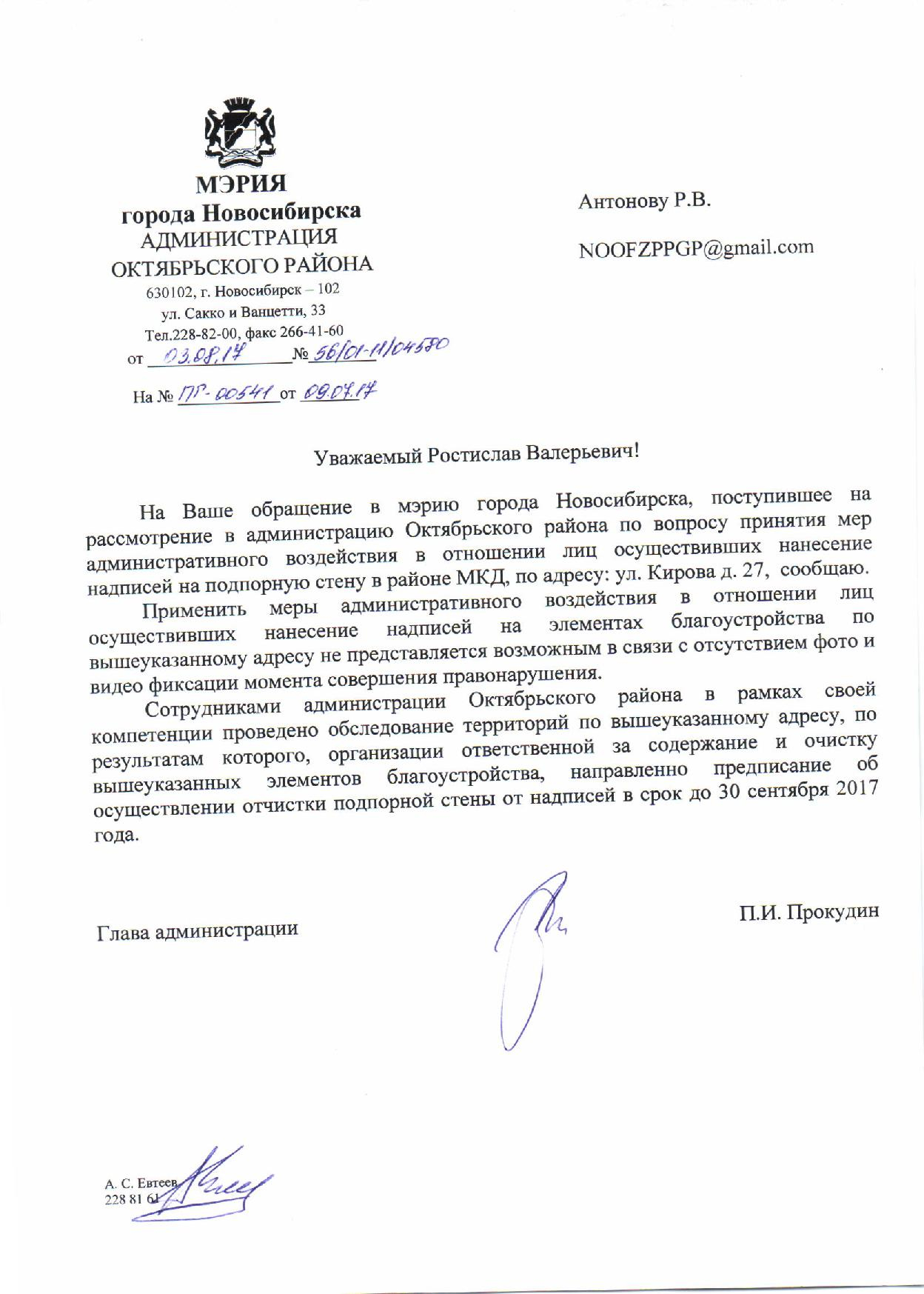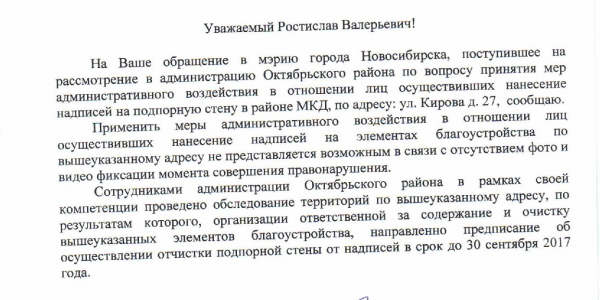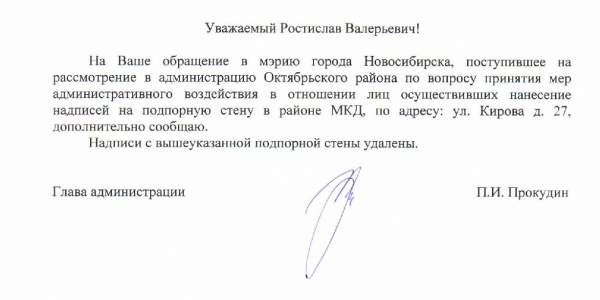Номер жалобы:20531 Тип жалобы:Иные проблемы ЖКХ Название объекта:Управляющая Компания Регион:Новосибирская область Город:Новосибирск Адрес:ул. Кирова, 27 строение 2 Описание жалобы:Надписи на стенах Статус: