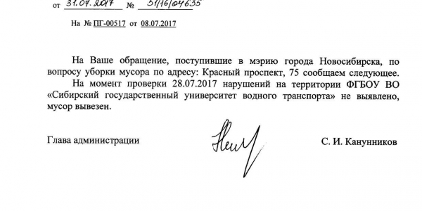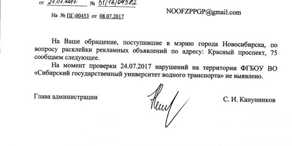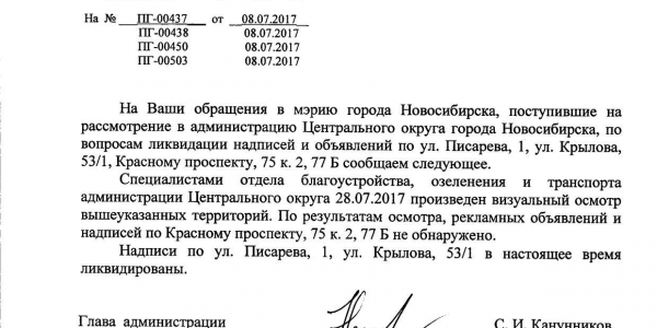 Номер жалобы:20429 Тип жалобы:Иные проблемы ЖКХ Название объекта:Управляющая Компания Регион:Новосибирская область Город:Новосибирск Адрес:Красный пр., 77Б Описание жалобы:Объявления в неположенном месте Статус: