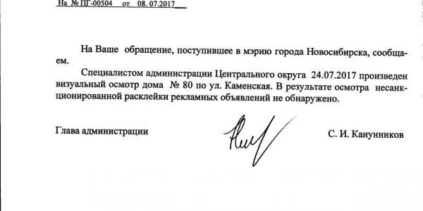 Номер жалобы:20444 Тип жалобы:Иные проблемы ЖКХ Название объекта:Управляющая Компания Регион:Новосибирская область Город:Новосибирск Адрес:ул. Каменская, 80 Описание жалобы:Каменская 80 несанкционированная реклама Статус:
