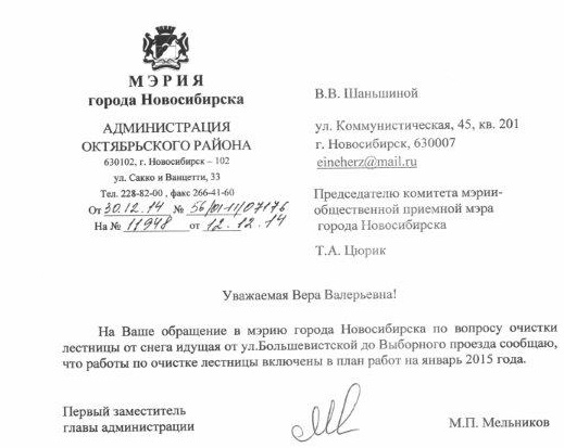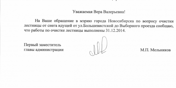 Номер жалобы:606 Тип жалобы:Качество уборки снега на дорогах Название объекта: Город:Новосибирск Адрес:Большевистская ул. 138 Описание жалобы:Лестница превратилась в горку. Спуск с Большевистской к Выборному пер. Статус: