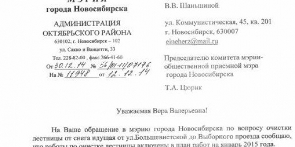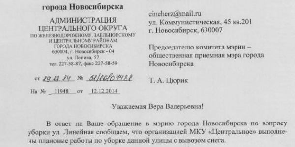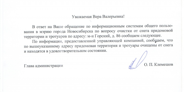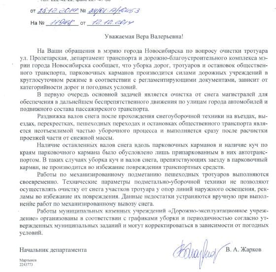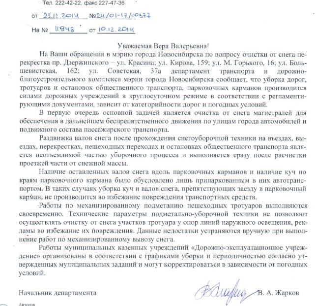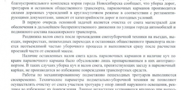 Номер жалобы:588 Тип жалобы:Качество уборки снега на дорогах Название объекта:Мэрия Город:Новосибирск Адрес:Советская улицa 37А Описание жалобы:Не чистят внутриквартальные проезды Статус: