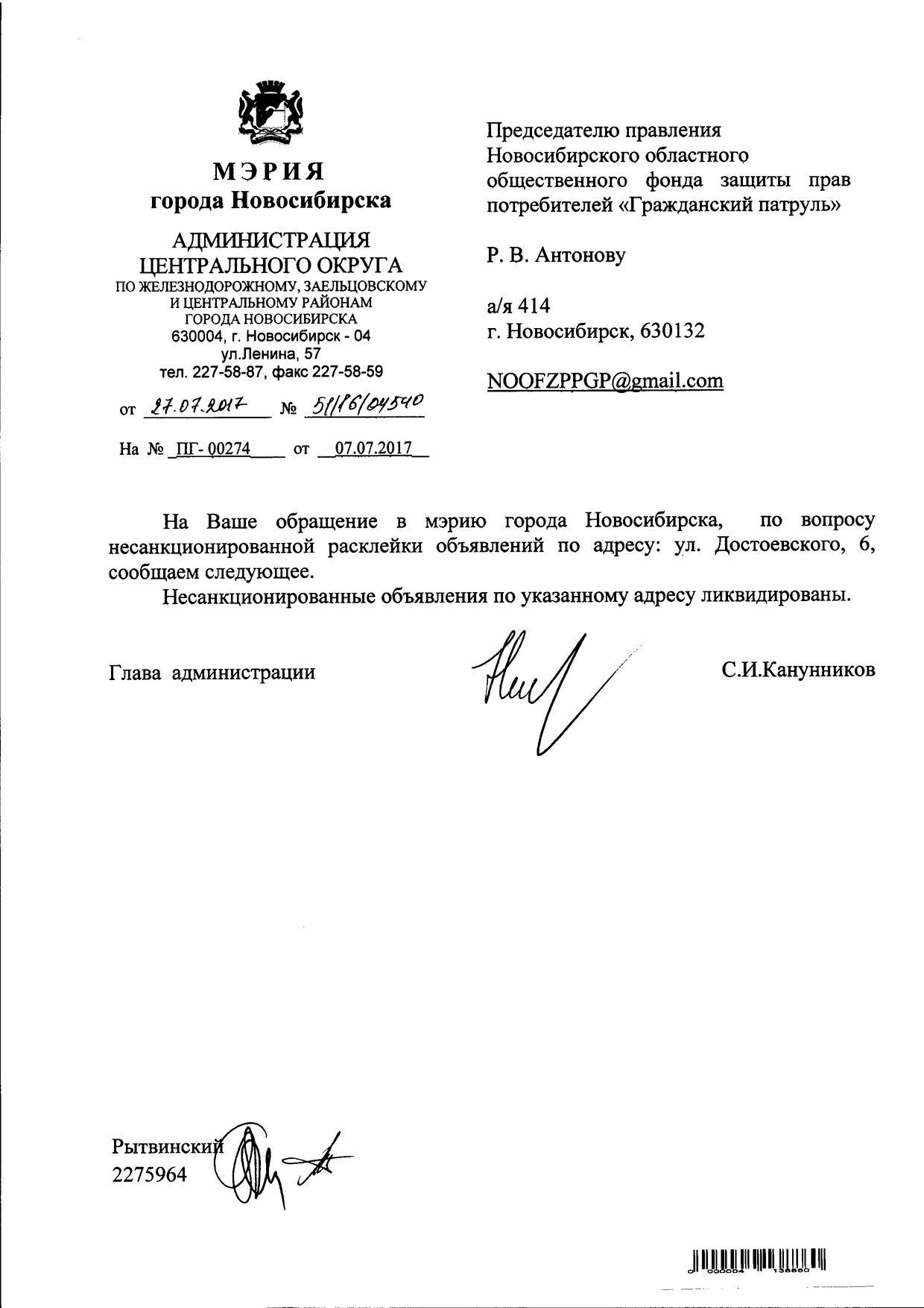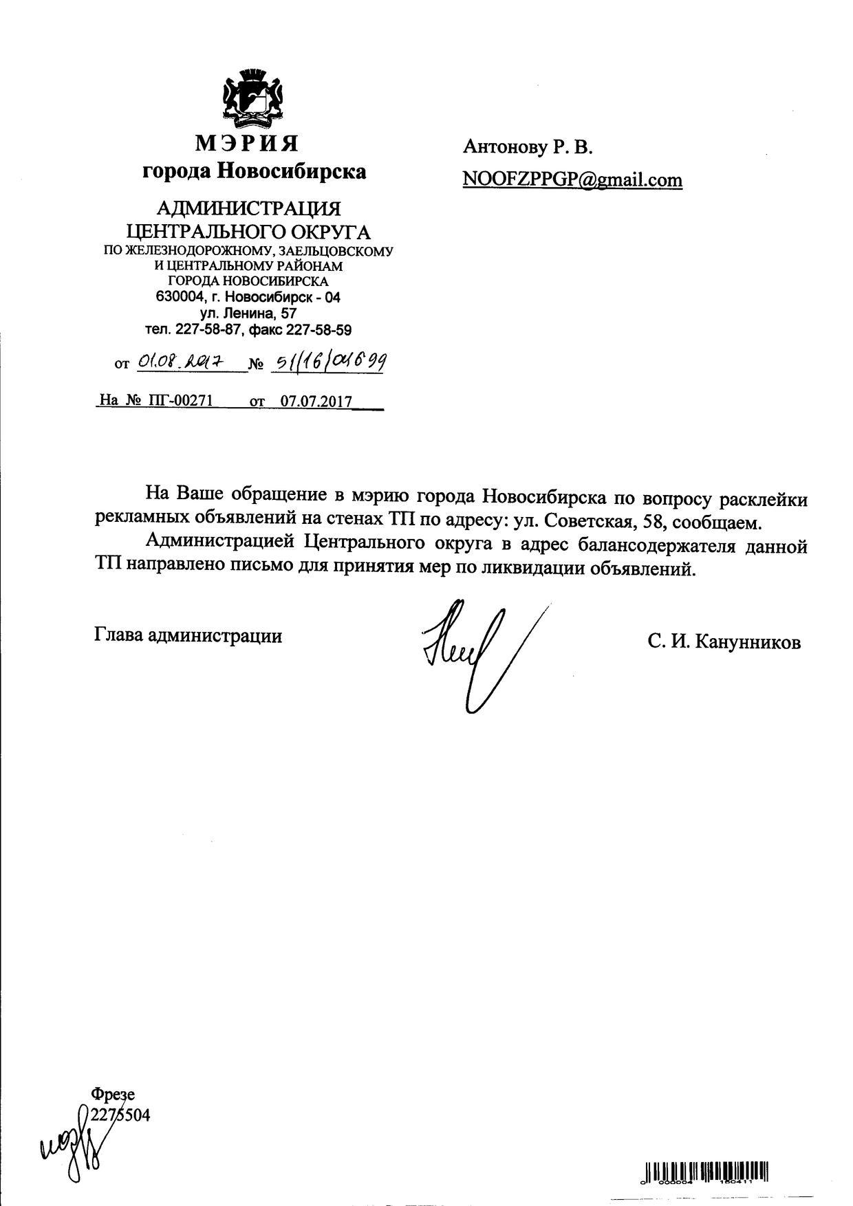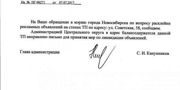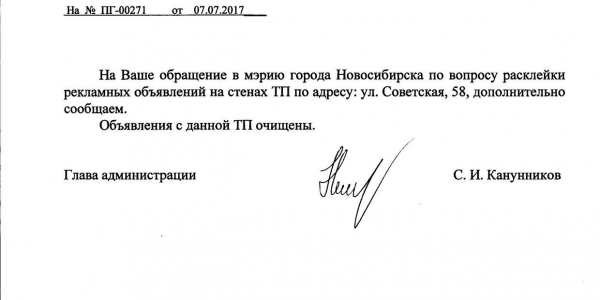 Номер жалобы:20374 Тип жалобы:Иные проблемы ЖКХ Название объекта:Управляющая Компания Регион:Новосибирская область Город:Новосибирск Адрес:ул. Советского, 48 Описание жалобы:Советского 48 объявления на хозяйственном корпусе Статус: