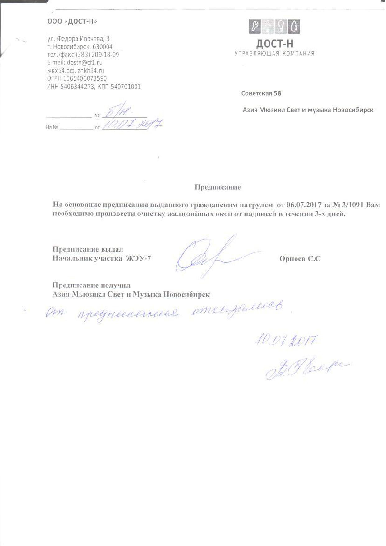 Номер жалобы:20399 Тип жалобы:Иные проблемы ЖКХ Название объекта:Управляющая Компания Регион:Новосибирская область Город:Новосибирск Адрес:ул. Советская, 58 Описание жалобы:Объявления на хозяйственном корпусе Статус: