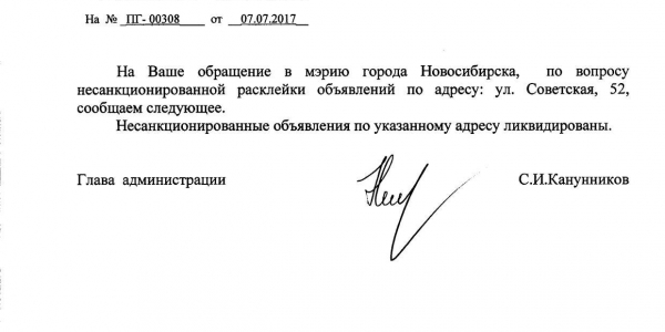 Номер жалобы:20384 Тип жалобы:Иные проблемы ЖКХ Название объекта:Управляющая Компания Регион:Новосибирская область Город:Новосибирск Адрес:ул. Советская, 52 Описание жалобы:Объявления в неположенном месте Статус: