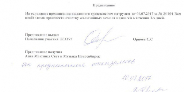 Номер жалобы:20387 Тип жалобы:Иные проблемы ЖКХ Название объекта:Управляющая Компания Регион:Новосибирская область Город:Новосибирск Адрес:ул. Советская, 56 Описание жалобы:Надписи на фасаде Статус: