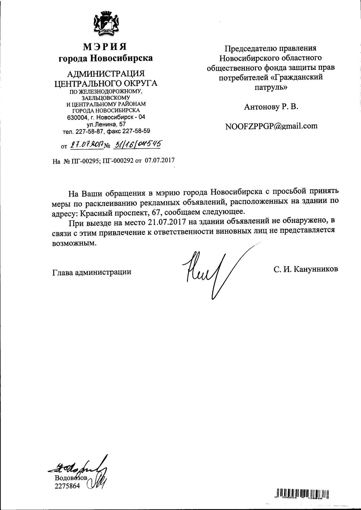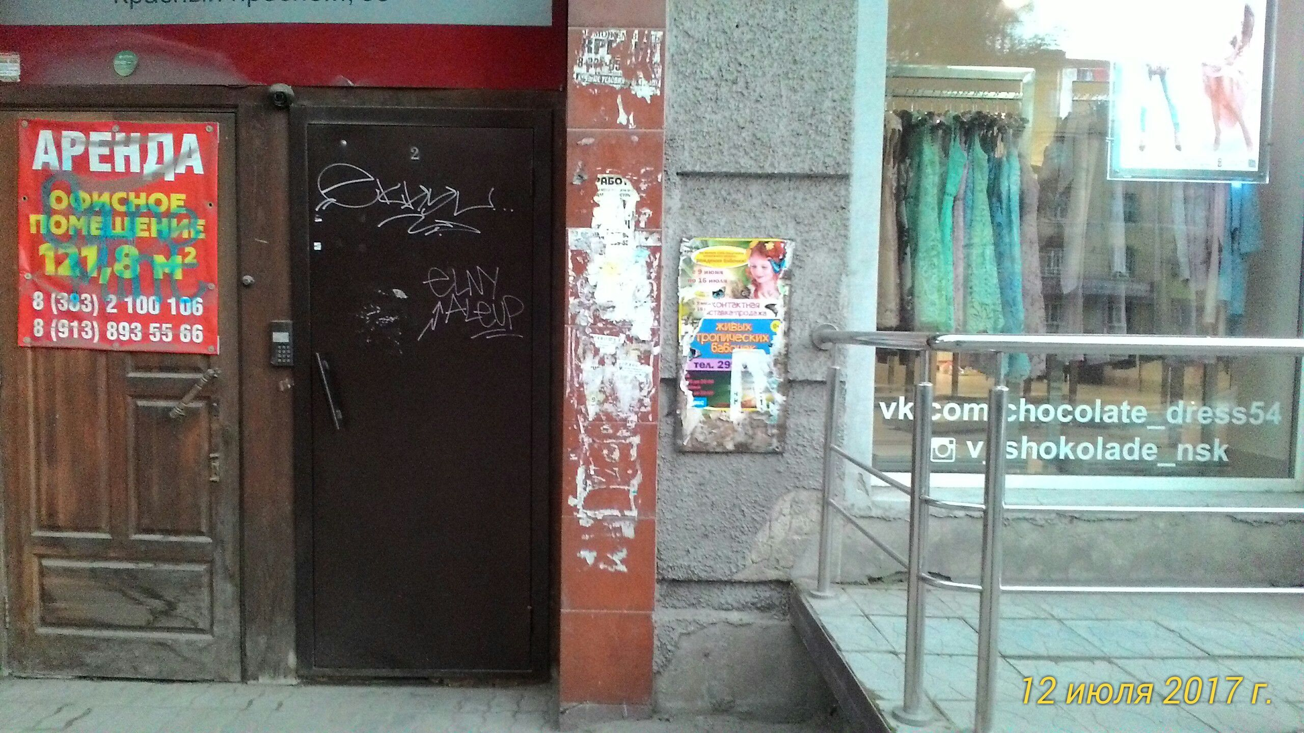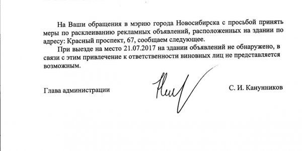 Номер жалобы:20316 Тип жалобы:Иные проблемы ЖКХ Название объекта:Управляющая Компания Регион:Новосибирская область Город:Новосибирск Адрес:Красный пр., 67 Описание жалобы:Надписи и объявления на фасаде Статус: