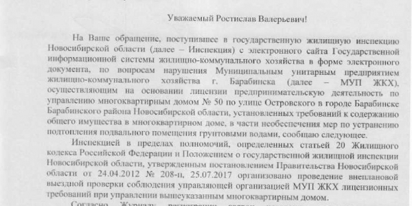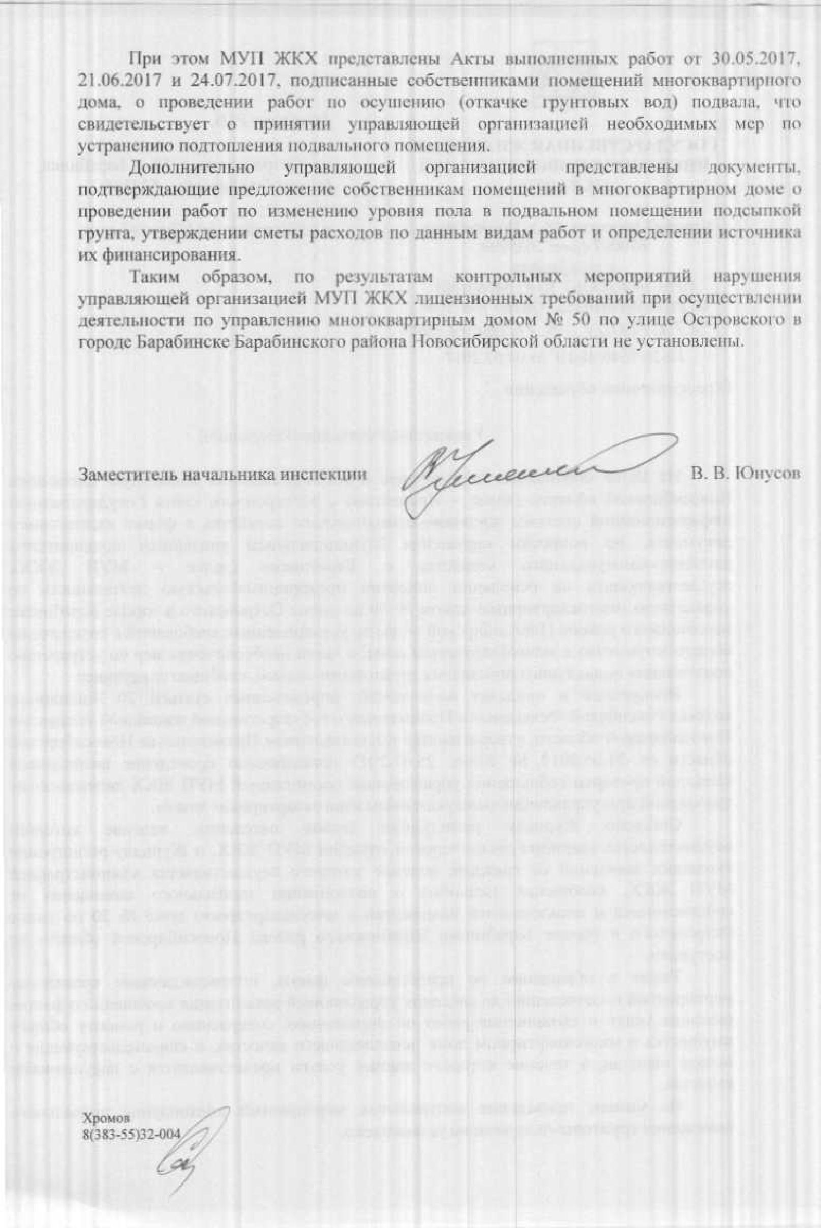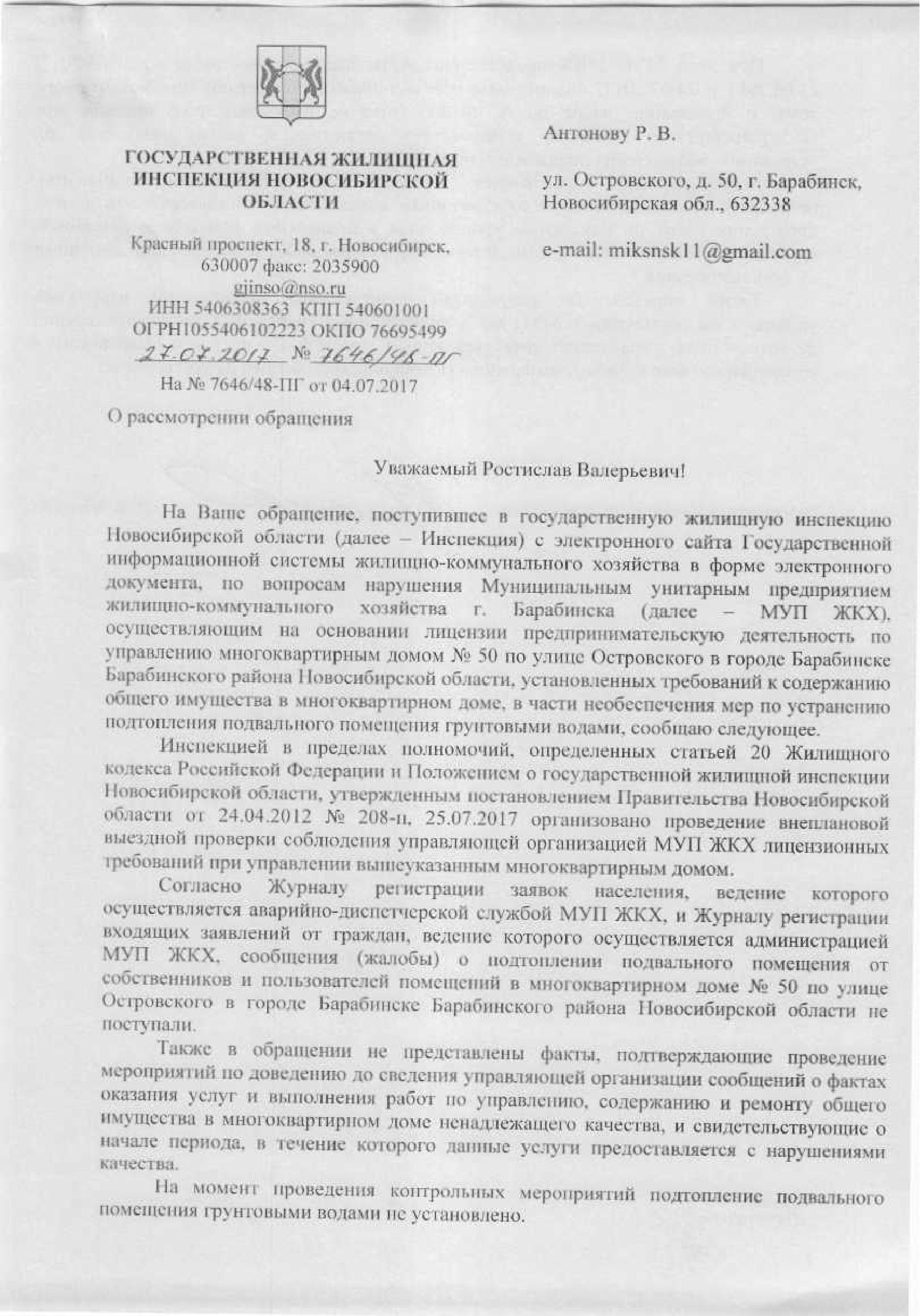Номер жалобы:19820 Тип жалобы:Иные проблемы ЖКХ Название объекта:Муп Жкх Регион:Новосибирская область Город:Барабинск Адрес:ул. Островского, 50 Описание жалобы:Затоплен подвал грунтовыми водами. Статус: