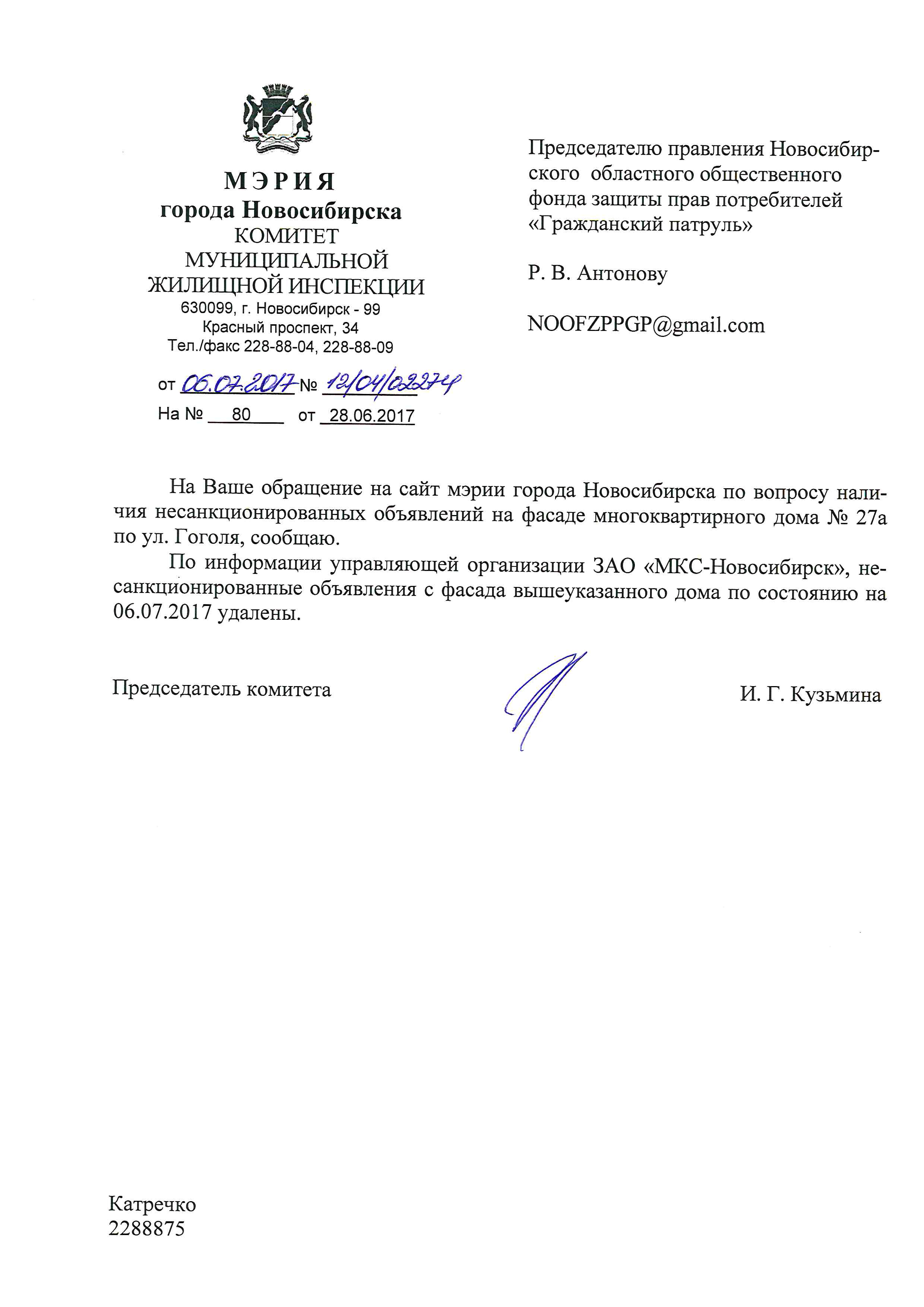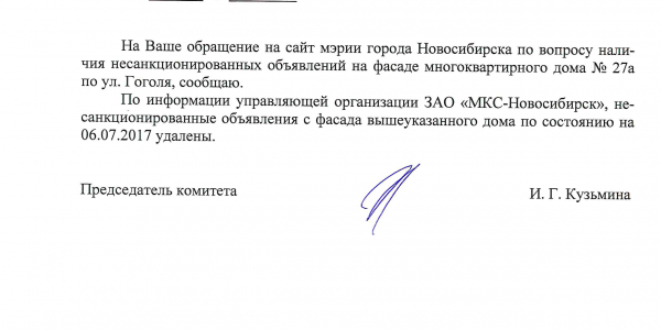 Номер жалобы:19829 Тип жалобы:Иные проблемы ЖКХ Название объекта:Управляющая Компания Регион:Новосибирская область Город:Новосибирск Адрес:ул. Гоголя, 27А Описание жалобы:Гоголя 27 объявления на фасаде Статус: