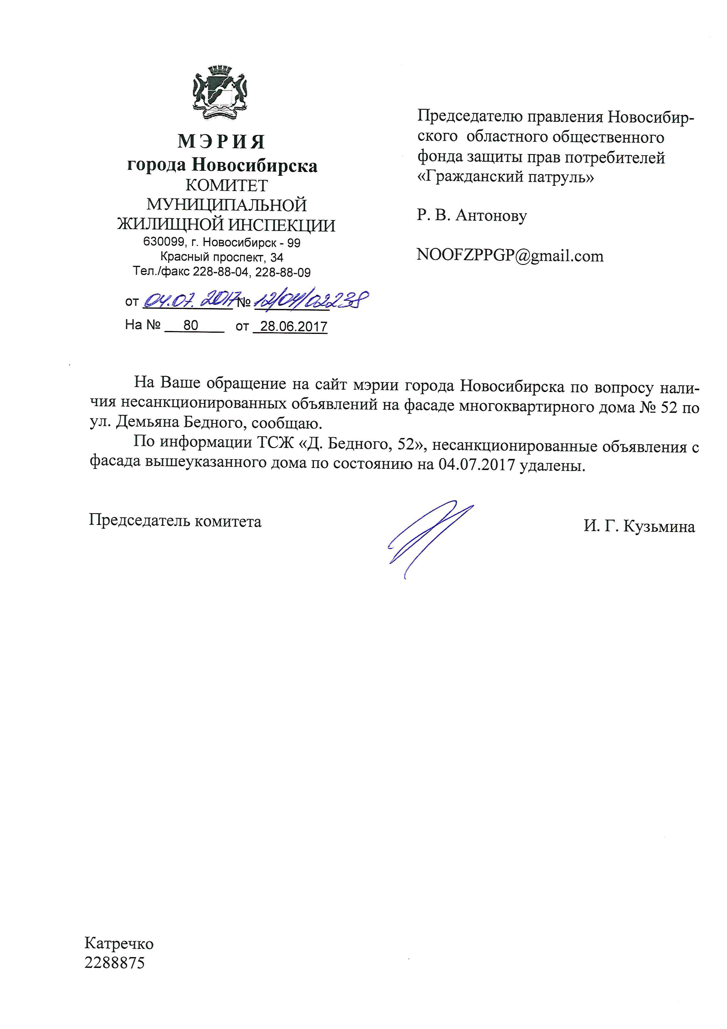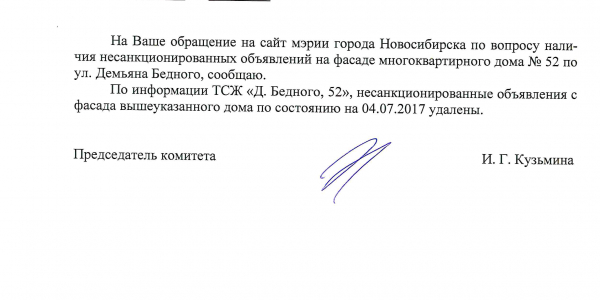 Номер жалобы:19839 Тип жалобы:Иные проблемы ЖКХ Название объекта:Управляющая Компания Регион:Новосибирская область Город:Новосибирск Адрес:ул. Демьяна Бедного, 52 Описание жалобы:Объявления на фасаде дома Статус: