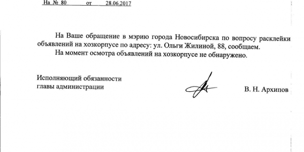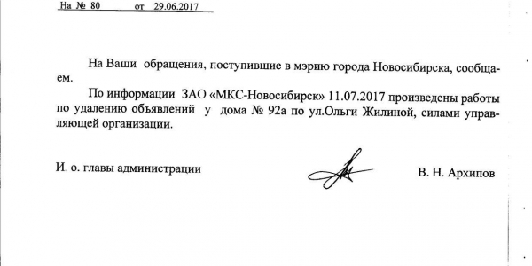 Номер жалобы:19834 Тип жалобы:Иные проблемы ЖКХ Название объекта:Управляющая Компания Регион:Новосибирская область Город:Новосибирск Адрес:ул. Ольги Жилиной, 73 Описание жалобы:Объявления на фасаде Статус: