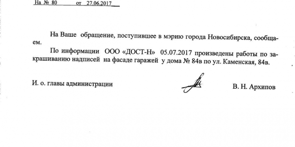 Номер жалобы:19792 Тип жалобы:Иные проблемы ЖКХ Название объекта:Управляющая Компания Регион:Новосибирская область Город:Новосибирск Адрес:ул. Каменская, 84В Описание жалобы:Надписи на гаражах вблизи дома Статус: