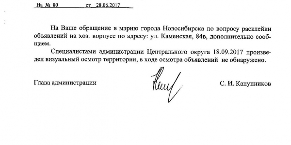 Номер жалобы:19793 Тип жалобы:Иные проблемы ЖКХ Название объекта:Управляющая Компания Регион:Новосибирская область Город:Новосибирск Адрес:ул. Каменская, 84В Описание жалобы:Надписи и объявления на хозяйственном к Статус: