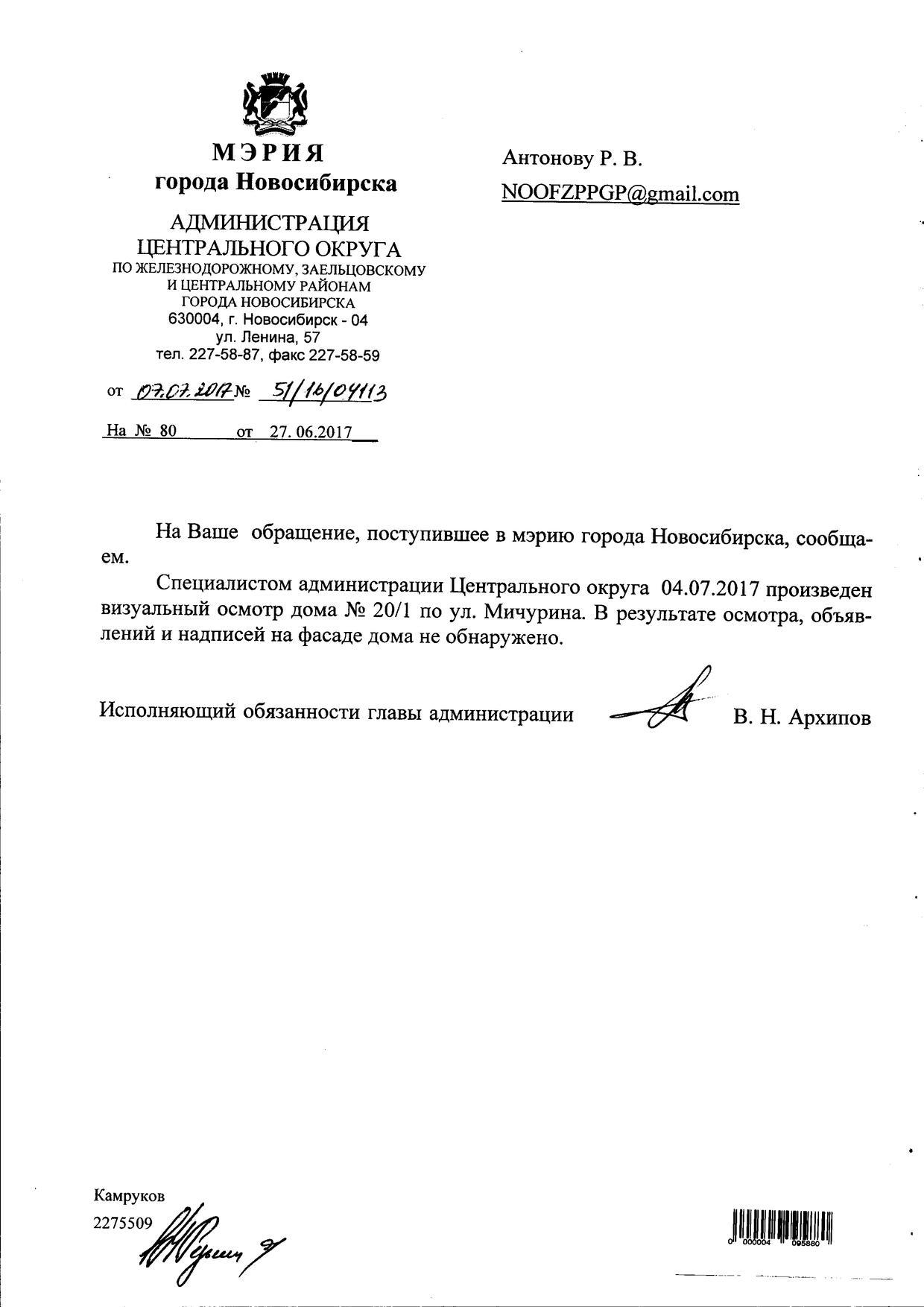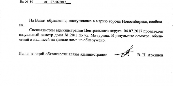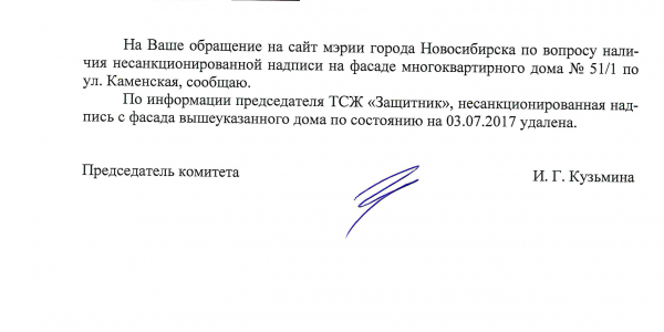 Номер жалобы:19772 Тип жалобы:Иные проблемы ЖКХ Название объекта:Управляющая Компания Регион:Новосибирская область Город:Новосибирск Адрес:ул. Каменская, 51/1 Описание жалобы:Надписи на фасаде дома Статус: