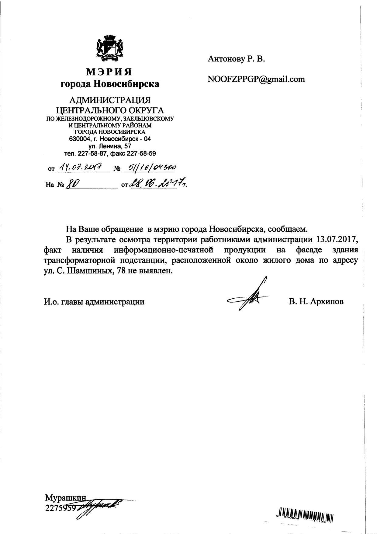 Номер жалобы:19788 Тип жалобы:Иные проблемы ЖКХ Название объекта:Администрация Регион:Новосибирская область Город:Новосибирск Адрес:ул. Лермонтова, 30А Описание жалобы:Объявления на столбах Статус: