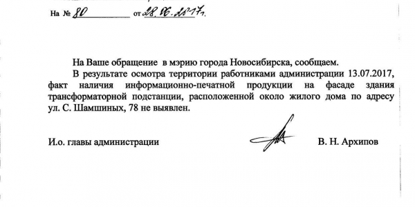 Номер жалобы:19785 Тип жалобы:Иные проблемы ЖКХ Название объекта:Управляющая Компания Регион:Новосибирская область Город:Новосибирск Адрес:ул. Семьи Шамшиных, 87 Описание жалобы:Семьи Шамшиных 87 надписи и объявления на хозяйственном Статус: