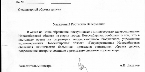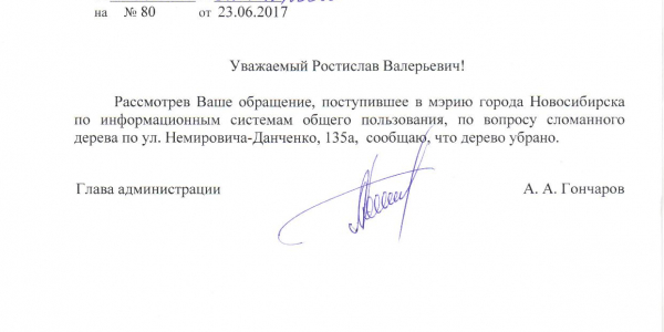 Номер жалобы:19546 Тип жалобы:Иные проблемы ЖКХ Название объекта:Управляющая Компания Регион:Новосибирская область Город:Новосибирск Адрес:ул. Немировича-Данченко, 135А Описание жалобы:За домом сломанное дерево Статус: