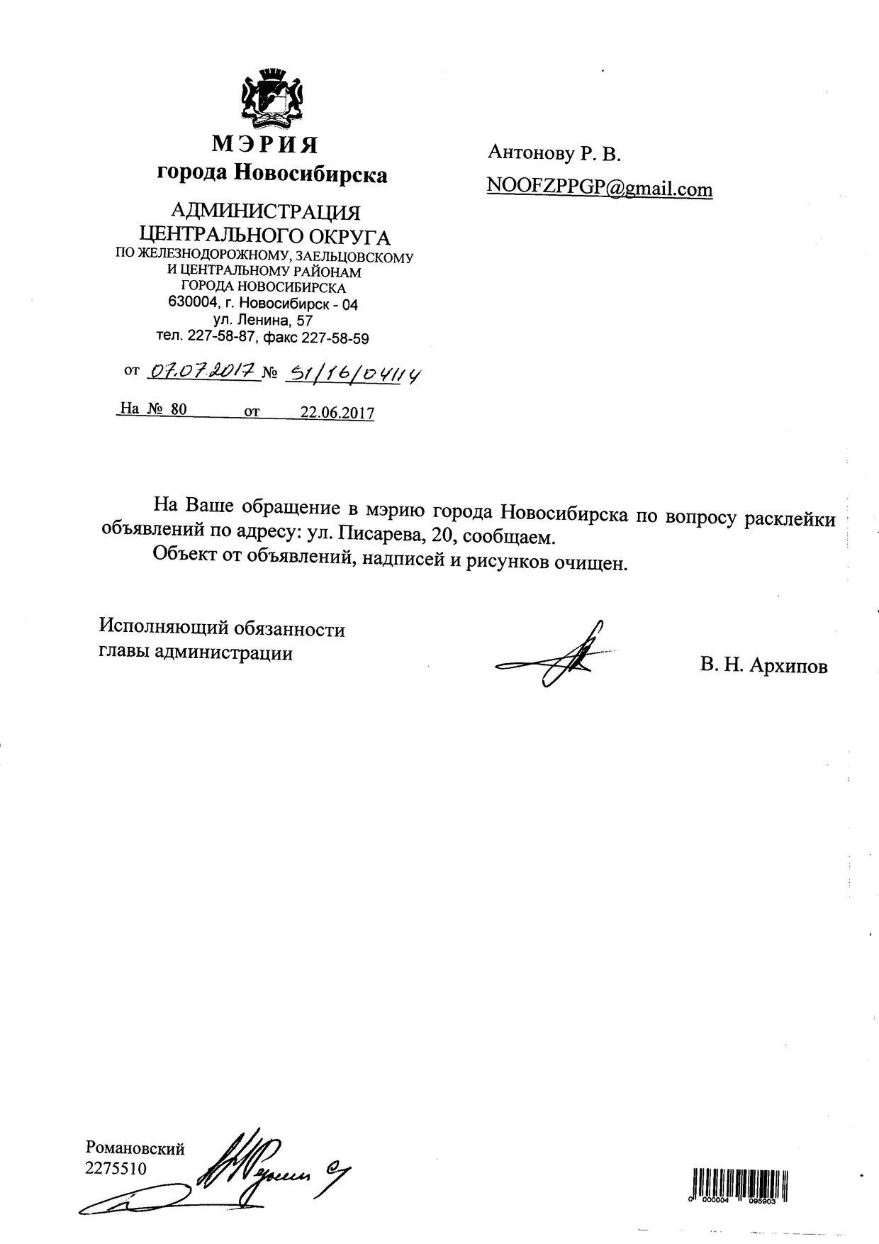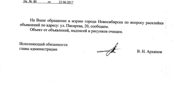 Номер жалобы:19369 Тип жалобы:Иные проблемы ЖКХ Название объекта:Администрация Регион:Новосибирская область Город:Новосибирск Адрес:ул. Писарева, 20 Описание жалобы:Объявления на столбе во дворе дома Статус: