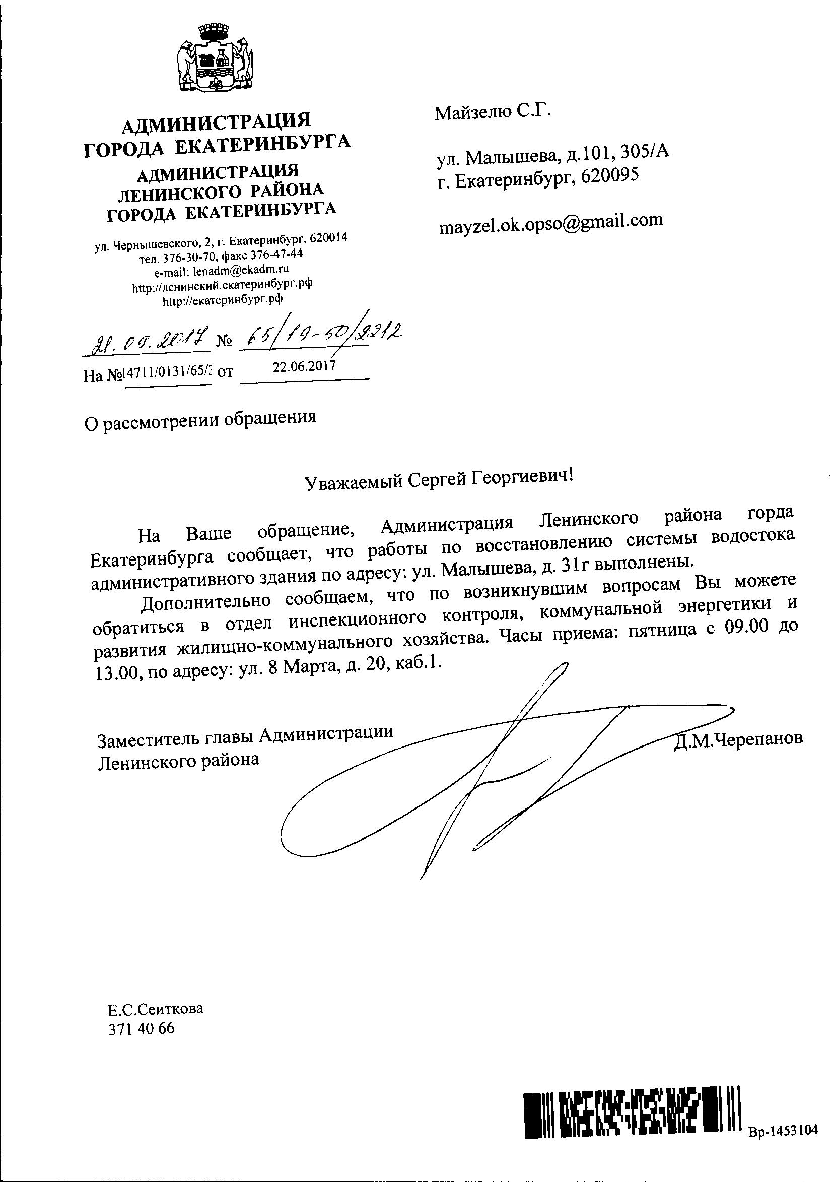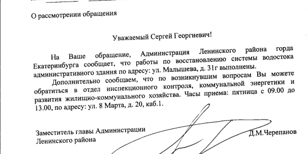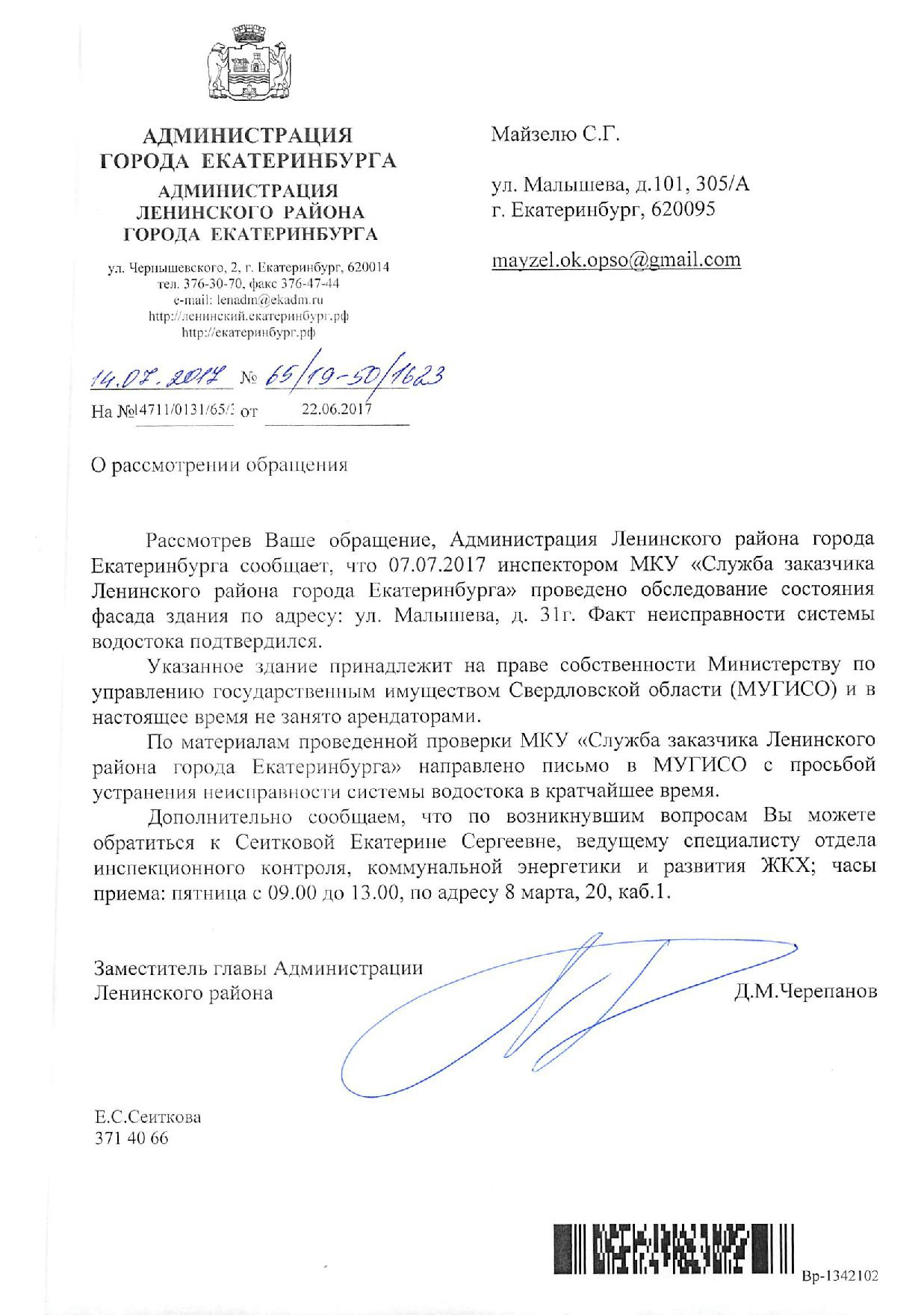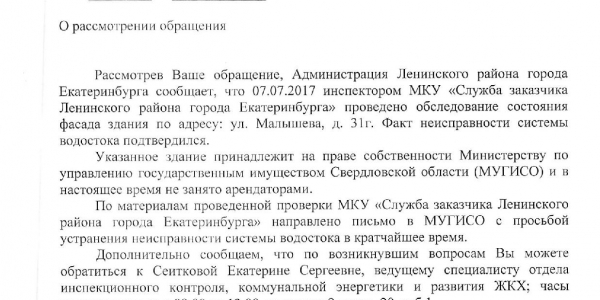 Номер жалобы:19471 Тип жалобы:Иные проблемы ЖКХ Название объекта:Водосточная Труба Сломана Регион:Свердловская область Город:Екатеринбург Адрес:Екатеринбург, улица Малышева, 31Г Описание жалобы:В верхней части водостока желоб отсоединился от трубы. Вода льётся на тротуар и на прохожих. Статус: