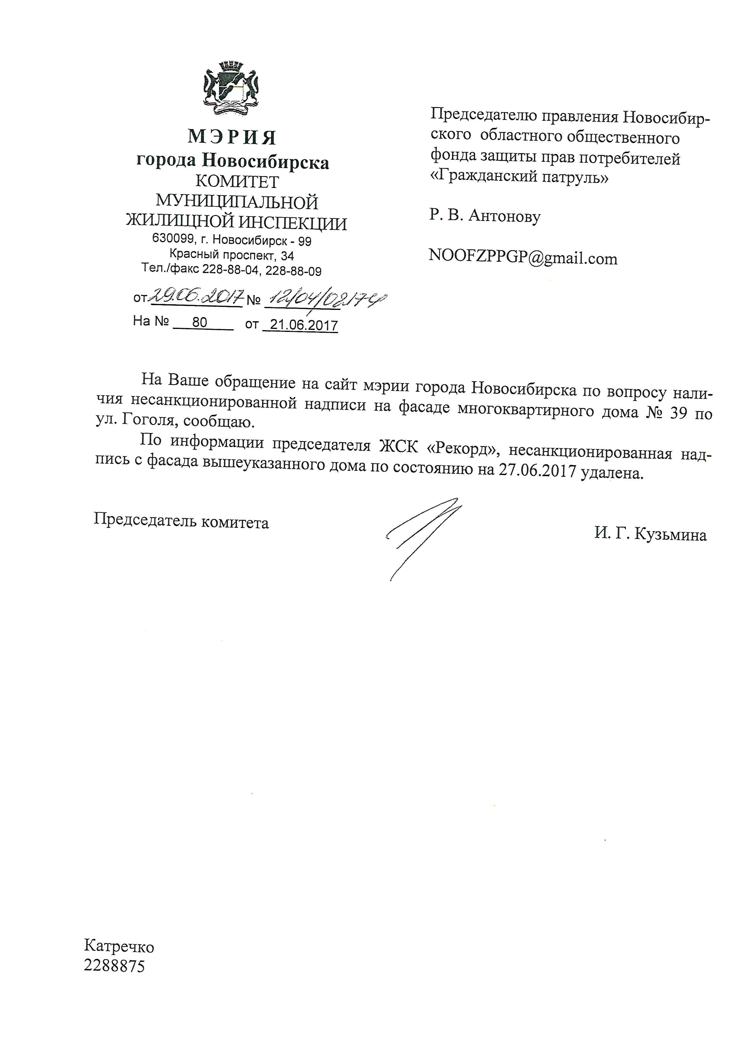 Номер жалобы:19314 Тип жалобы:Иные проблемы ЖКХ Название объекта:Управляющая Компания Регион:Новосибирская область Город:Новосибирск Адрес:ул. Гоголя, 37 Описание жалобы:Надписи на хоз корпусе Статус: