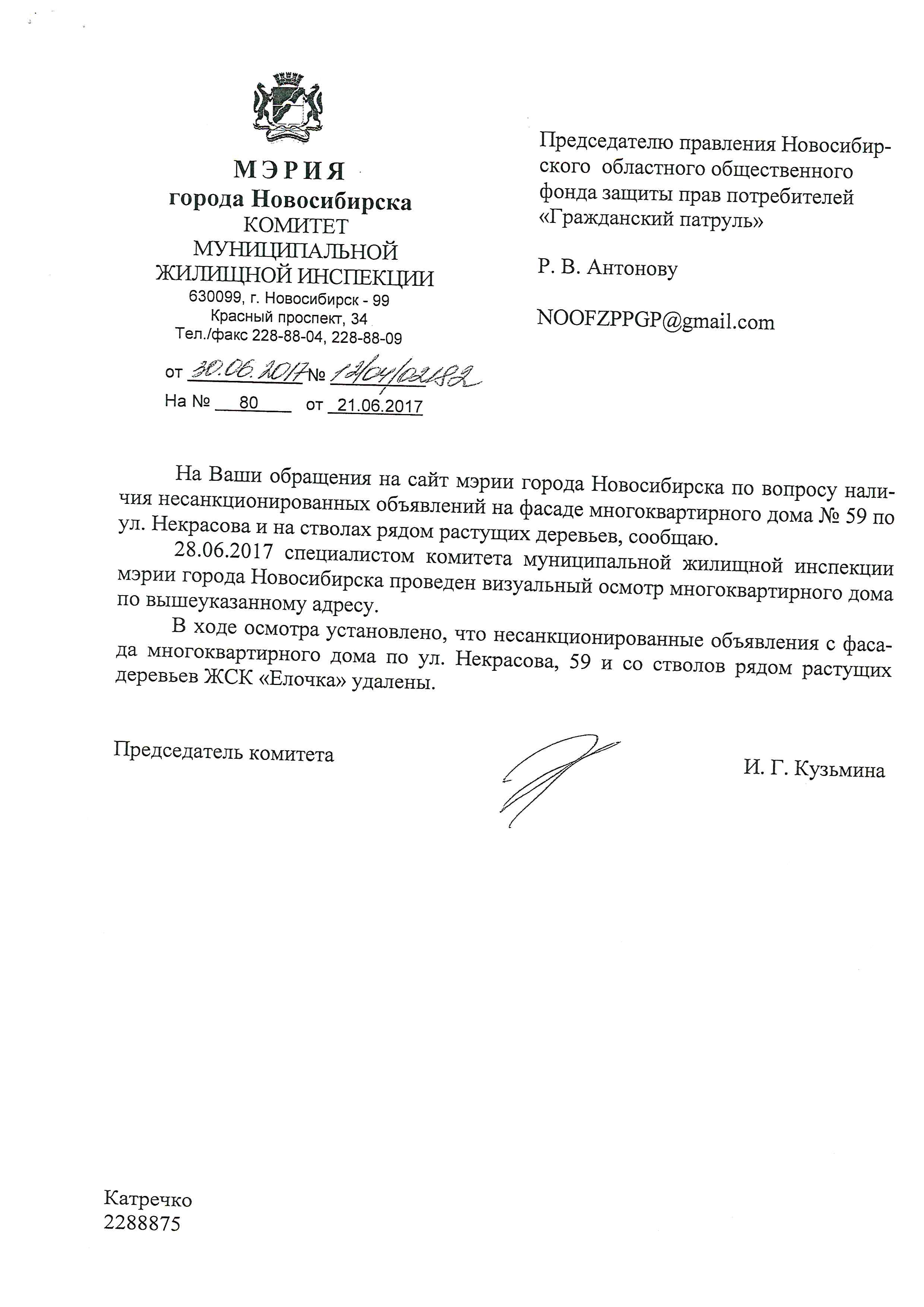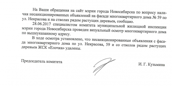 Номер жалобы:19320 Тип жалобы:Иные проблемы ЖКХ Название объекта:Управляющая Компания Регион:Новосибирская область Город:Новосибирск Адрес:ул. Некрасова, 59 Описание жалобы:Объявления на фасаде дома Статус:
