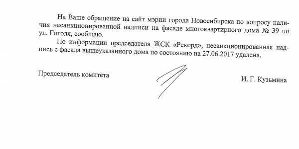 Номер жалобы:19312 Тип жалобы:Иные проблемы ЖКХ Название объекта:Управляющая Компания Регион:Новосибирская область Город:Новосибирск Адрес:ул. Гоголя, 39 Описание жалобы:Надписи на доме Статус: