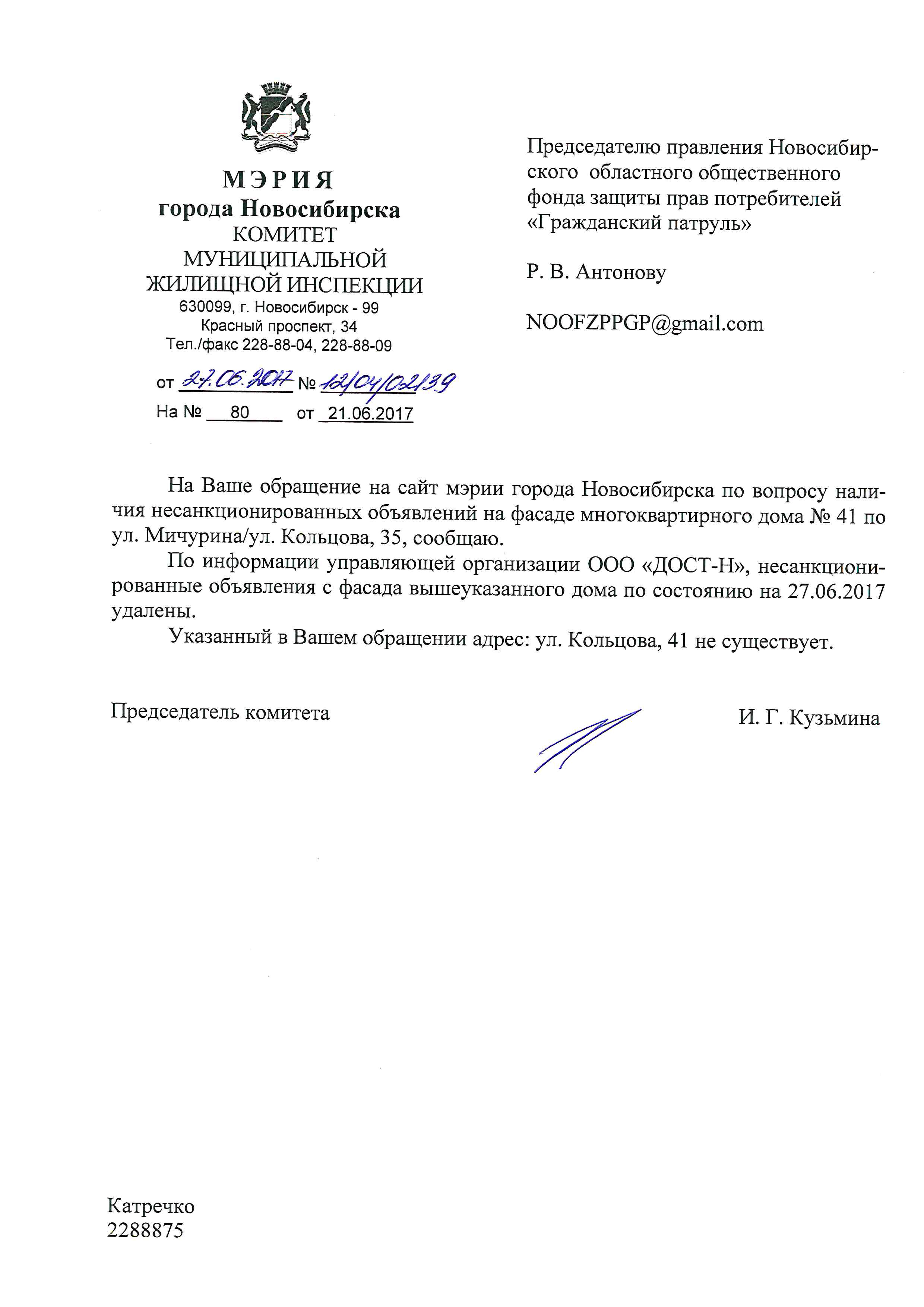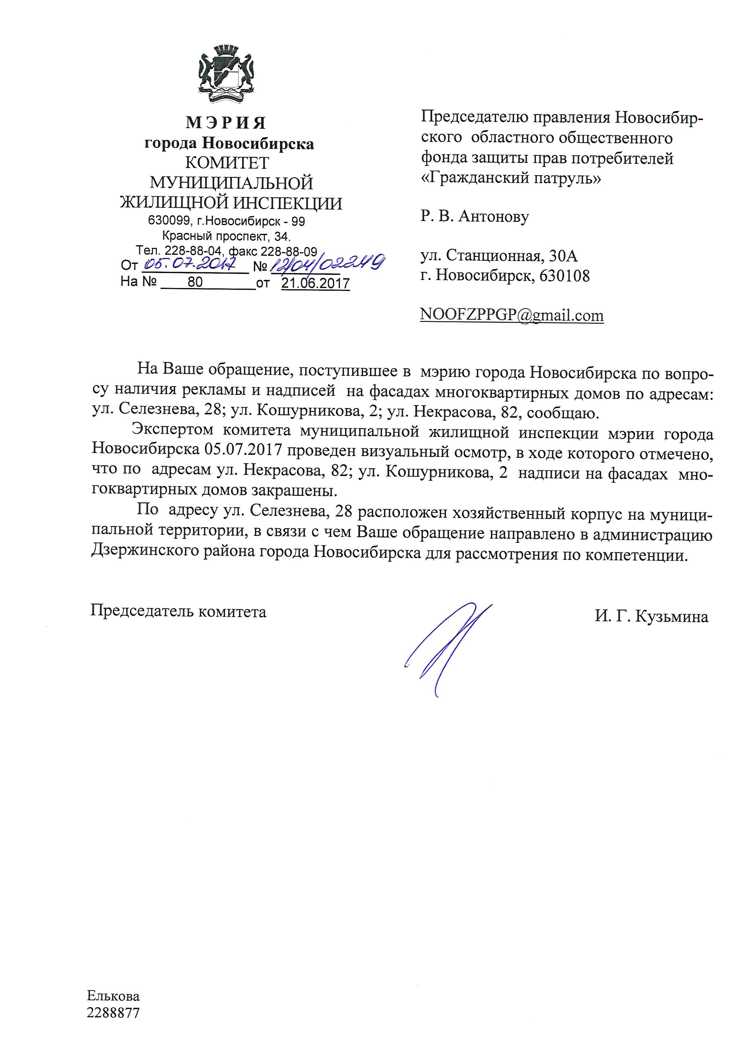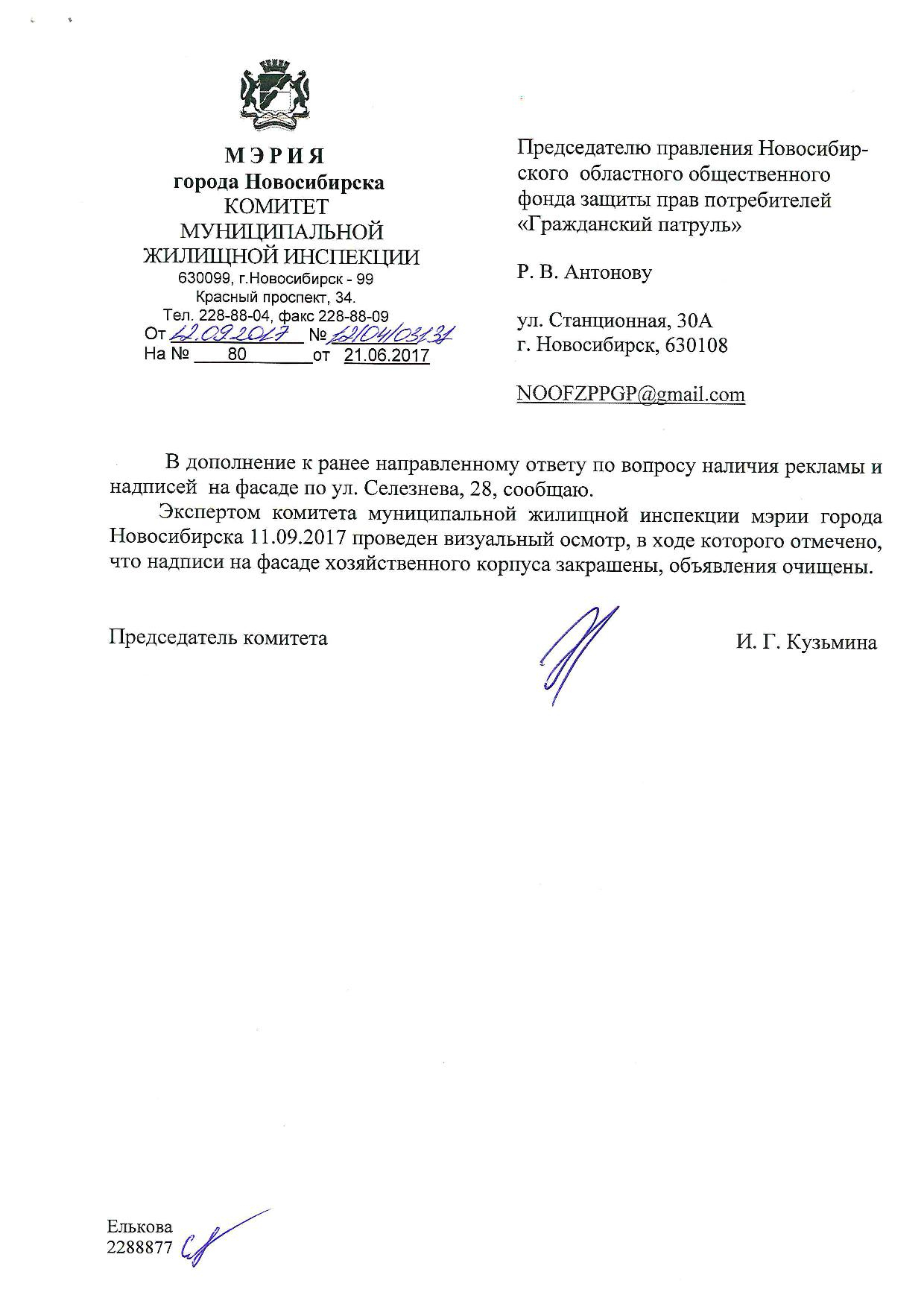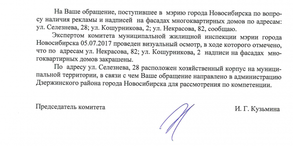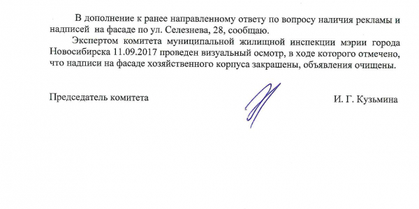 Номер жалобы:19305 Тип жалобы:Иные проблемы ЖКХ Название объекта:Управляющая Компания Регион:Новосибирская область Город:Новосибирск Адрес:ул. Селезнева, 28 Описание жалобы:Селезнева 28 к1 надписи Статус: