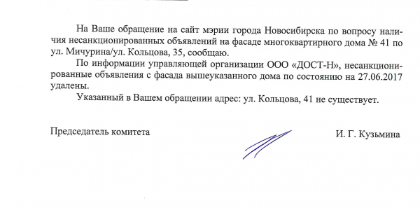 Номер жалобы:19285 Тип жалобы:Иные проблемы ЖКХ Название объекта:Управляющая Компания Регион:Новосибирская область Город:Новосибирск Адрес:ул. Мичурина, 39 Описание жалобы:Объявления вдоль забора Статус: