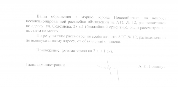 Номер жалобы:19307 Тип жалобы:Иные проблемы ЖКХ Название объекта:Управляющая Компания Регион:Новосибирская область Город:Новосибирск Адрес:ул. Селезнева, 28 Описание жалобы:Селезнева 28 к1 объявления на стенах Статус: