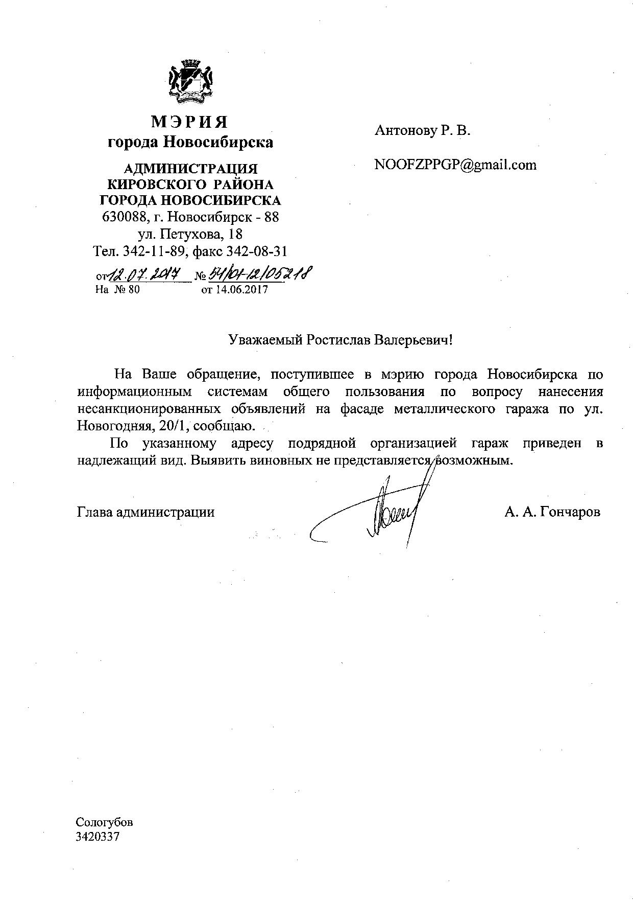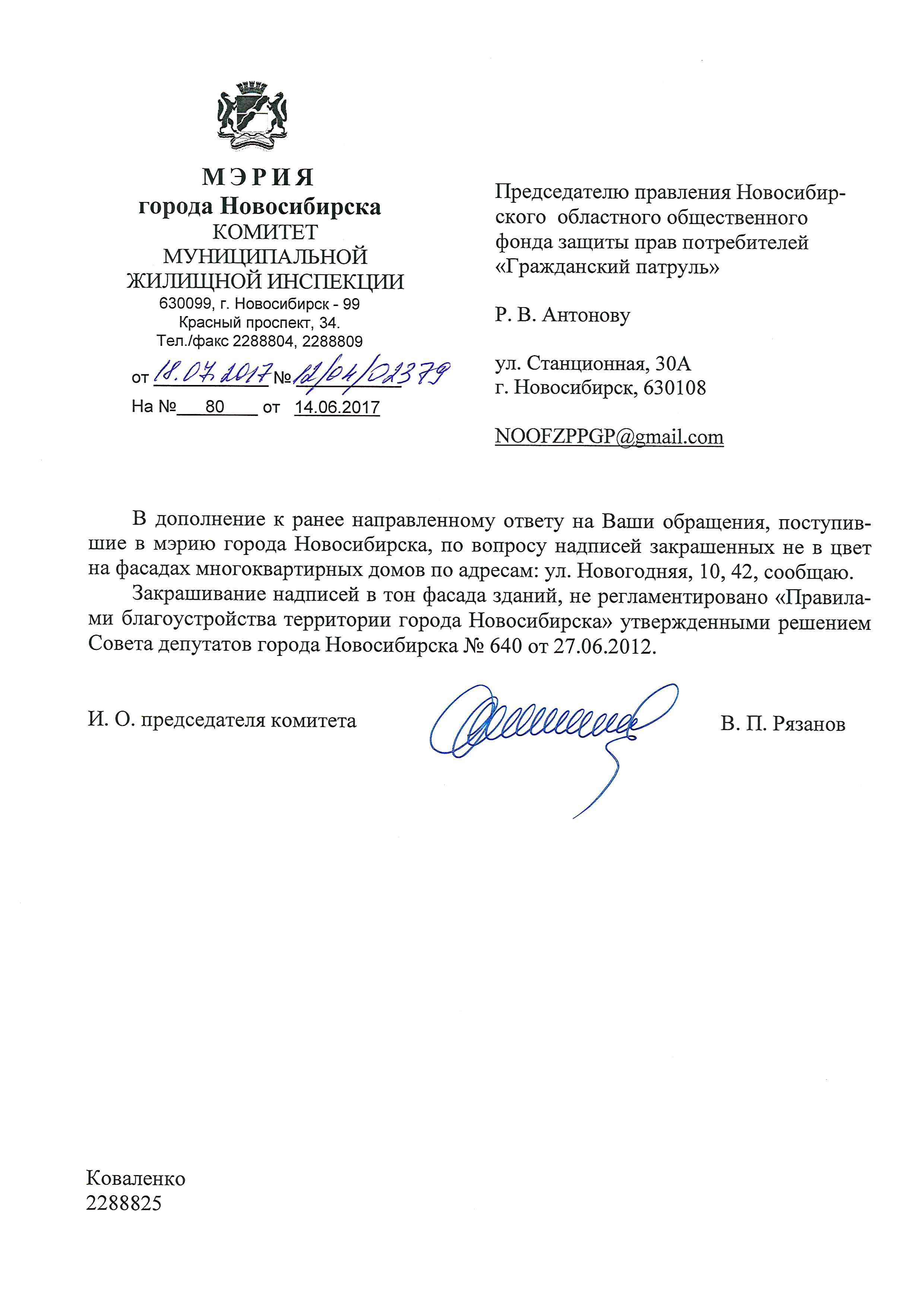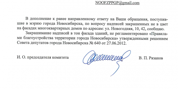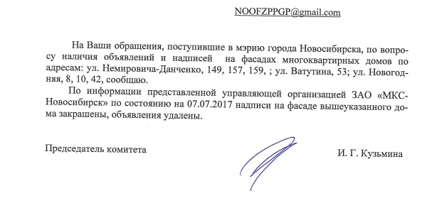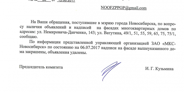 Номер жалобы:19218 Тип жалобы:Иные проблемы ЖКХ Название объекта:Управляющая Компания Регион:Новосибирская область Город:Новосибирск Адрес:Красный пр., 96 Описание жалобы:Надписи на доме Статус: