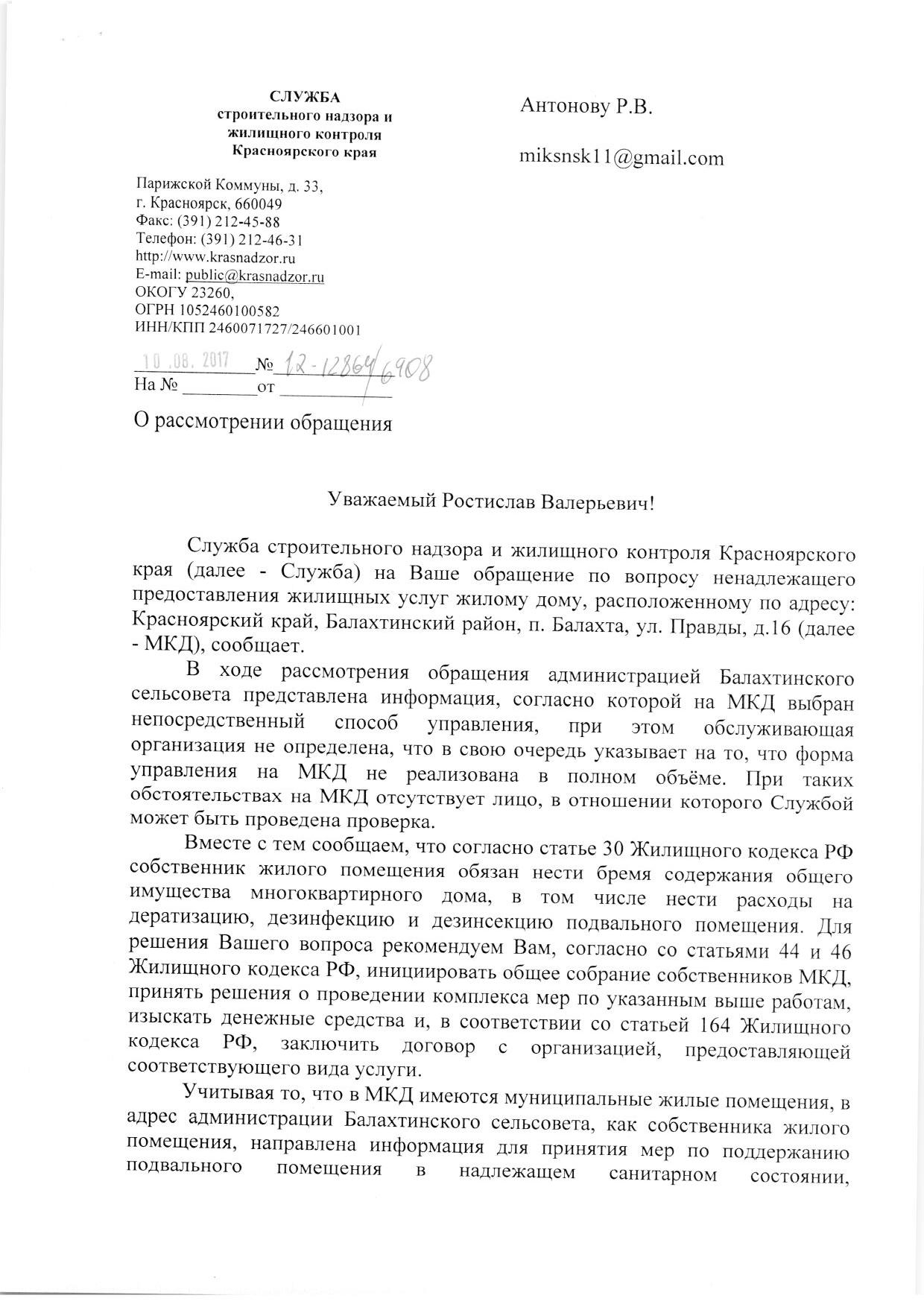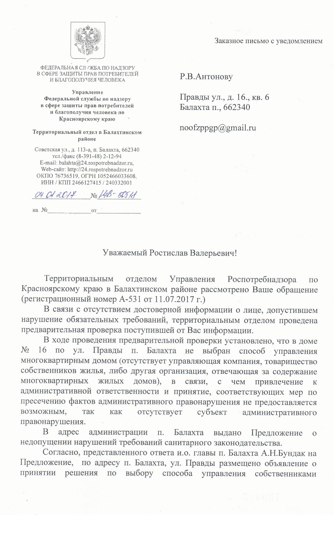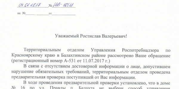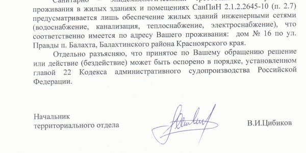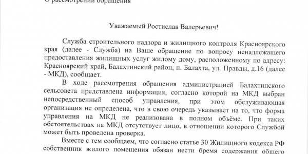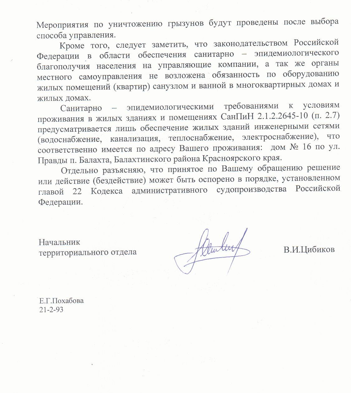 Номер жалобы:19150 Тип жалобы:Иные проблемы ЖКХ Название объекта:Балахта Регион:Красноярский край Город:Балахта Адрес:ул. Правды, 16 Описание жалобы:Здравствуйте,решила написать сюда,надеюсь на помощь.Дело в том что я живу в пос.Балахта Красноярского края,мама у меня была не лишена,она всю жизнь болела и я воспитывалась в детском доме.Дело в том что я незнаю куда мне обратиться,я живу в восьмиквартирном деревянном доме,дом построен в 1965 году,мне в этом доме кв.досталась так как мать в ней жила и ее пришлось мне приватизировать, так как я не сирота была,отец лишен мать нет из-за болезни,в дет.доме я прожила 10 лет,и хочу сказать что условий у меня никаких нет,даже участка под септик,со второго этажа я ношу ведра на улицу,на меня ругаются постоянно что нельзя мне на улицу носить,да и возможности и даже участка пож септик нет,мне взрослой девушке очень стыдно что я так живу в моем доме я одна без условий,стены пустые внутри и там постоянно скребутся мыши,в прошлом году я много травила мышей,в восьмиквартирном доме,должно ли так быть?Я незнаю куда мне обратиться и узнать полагается ли мне какая помощь либо участочек под септик,когда мама одна жила она не могла нечего сделать,так как всю жизнь она жила на мизирной пенсии по инвалидности.В поселке Приморск люди жили в таких же деревянных домах в таком же году построенном и их пересилили в новостройку,где справедливость, за кап ремонт платить еще 3 года,а как это все время жить и что они сделают через три года только покрасят снаружи и все.Фото снаружи и внутри моей кв.Родственников у меня нет,е мамы уже год как нет,я одна,а в администрацию одна не могу пойти боюсь засмеют,да и поддержать никто меня не сможет,нет человека для поддержки.Надеюсь на ваш ответ.# Статус: