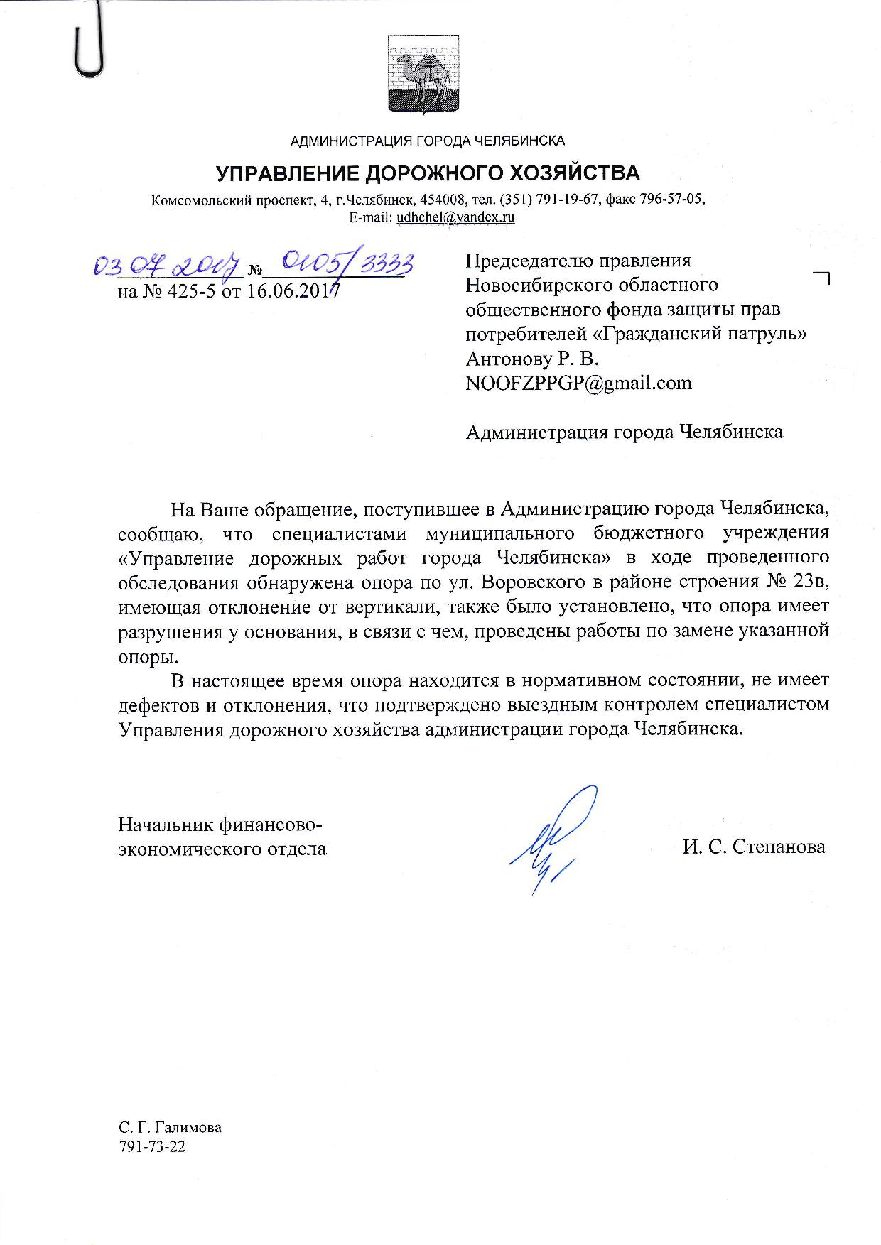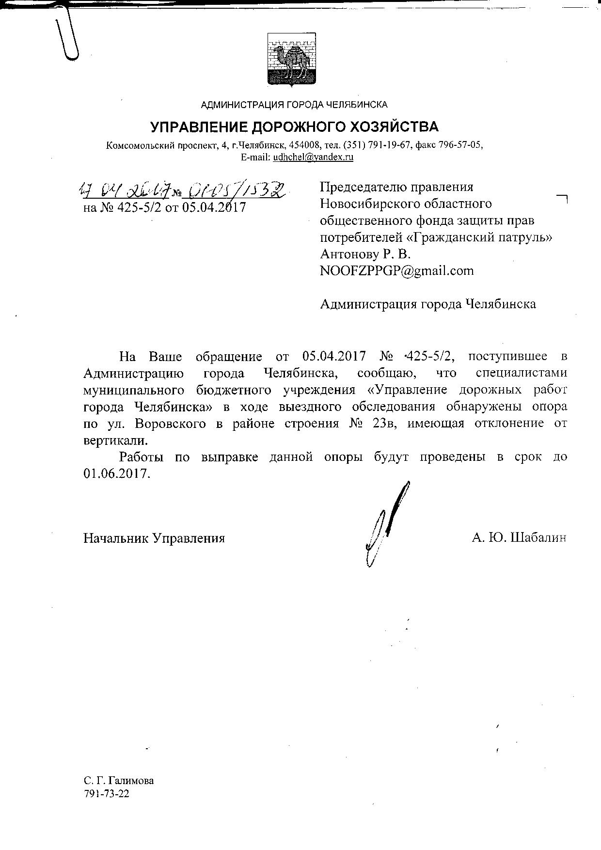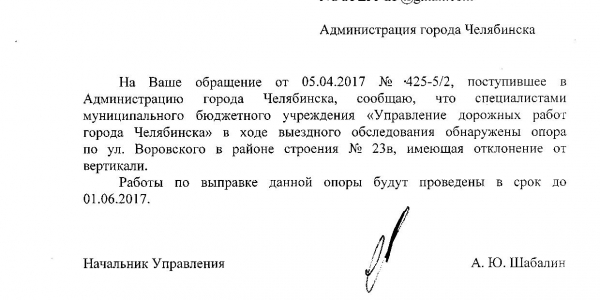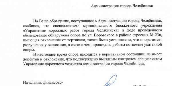 Номер жалобы:19186 Тип жалобы:Иные проблемы ЖКХ Название объекта:Мэрия Город:Челябинск Адрес:Челябинск, улица Воровского, 23В Описание жалобы:Повтор 16243. Обещали поправить столб до 1 июня, до сих пор не поправили. Статус: