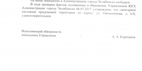 Номер жалобы:19177 Тип жалобы:Иные проблемы ЖКХ Название объекта:УК Город:Челябинск Адрес:Челябинск, улица Овчинникова, 6Б Описание жалобы:Земля выше уровня бордюра, будет грязь на дороге во время дождя. Грунт не укреплен газоном и не закрыт, будет образовываться пыль во время ветра. Статус: