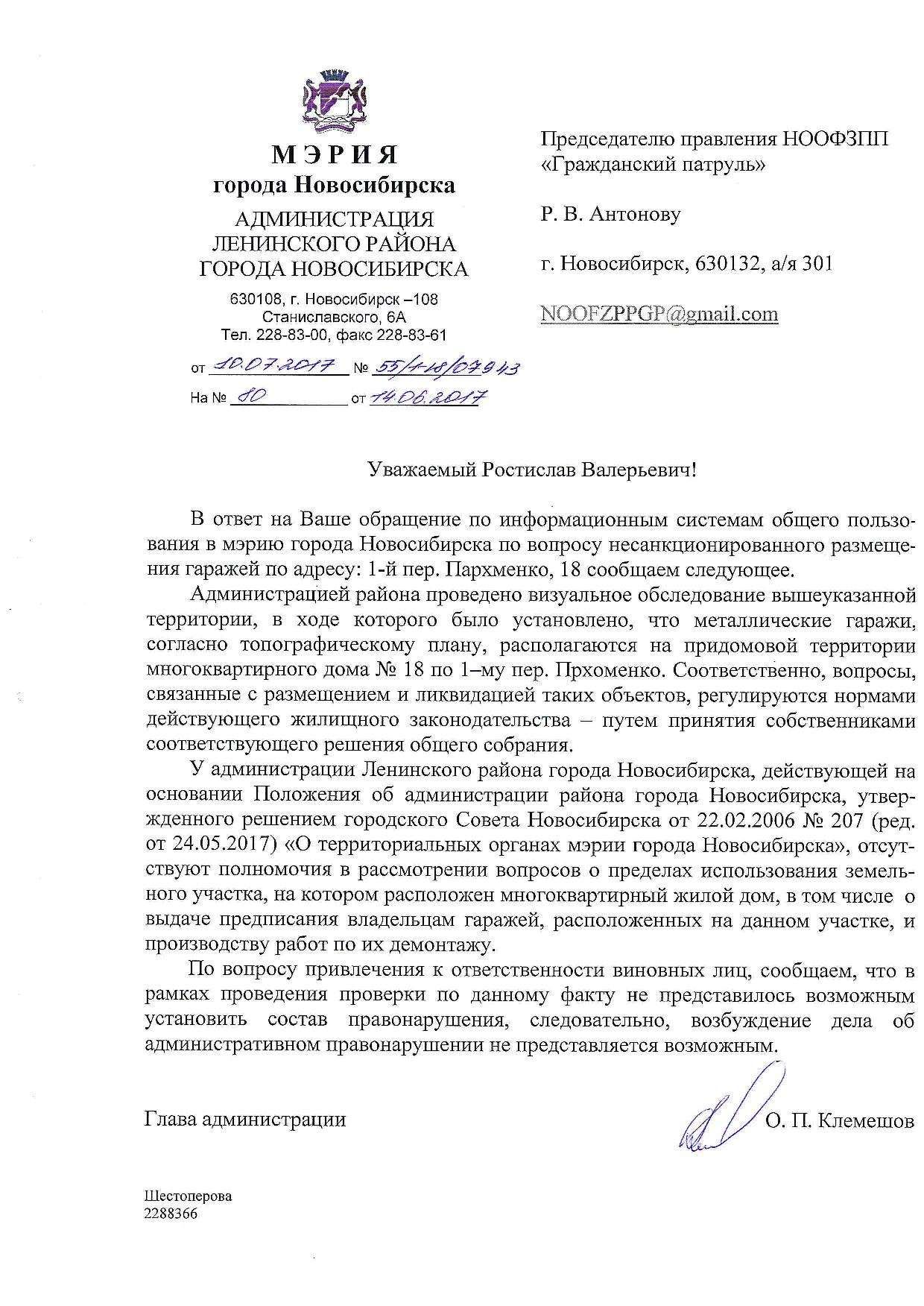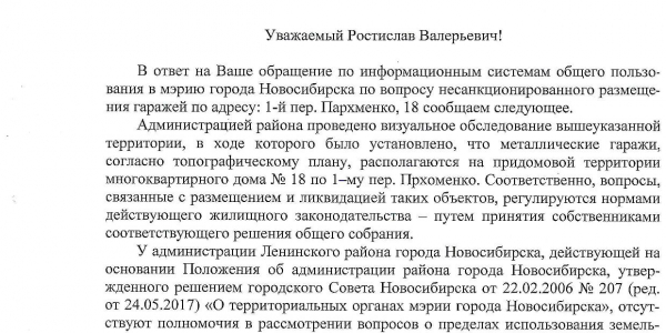 Номер жалобы:18949 Тип жалобы:Иные проблемы ЖКХ Название объекта:Управляющая Компания Город:Новосибирск Адрес:Новосибирск, 1-й переулок Пархоменко, 18 Описание жалобы:Гаражи на газоне Статус: