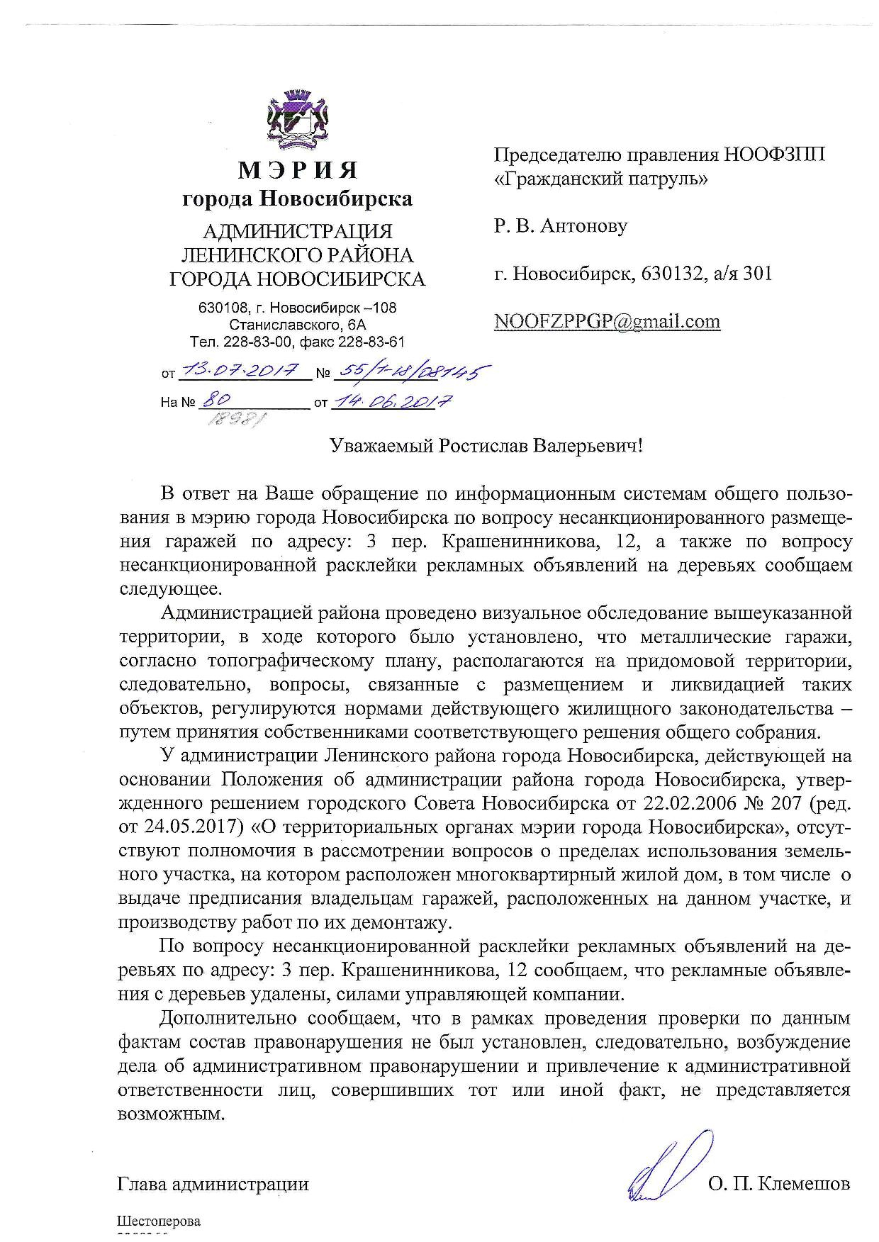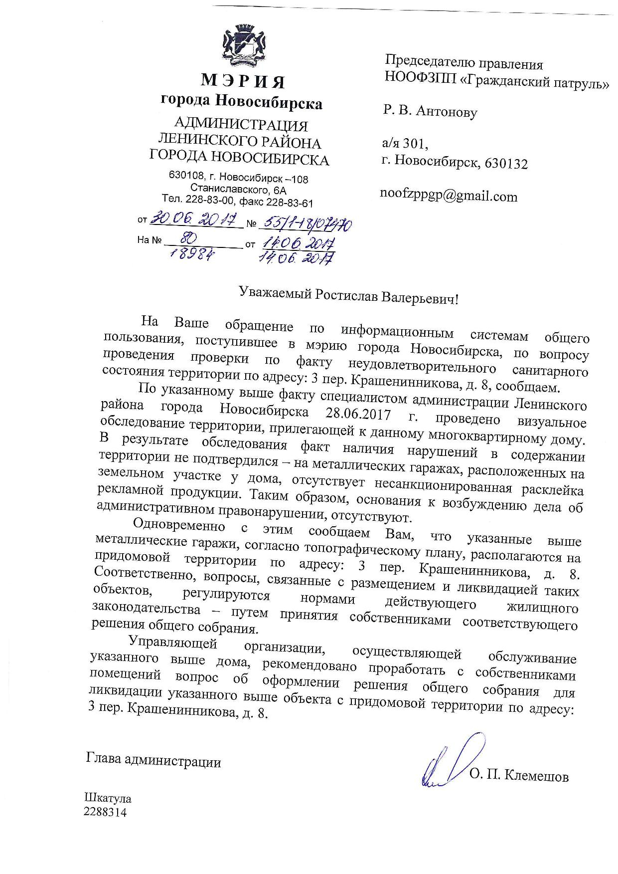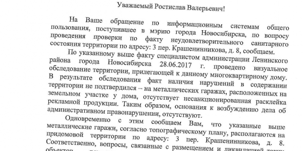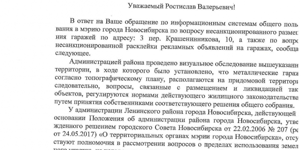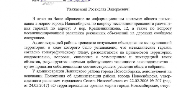 Номер жалобы:18981 Тип жалобы:Иные проблемы ЖКХ Название объекта:Управляющая Компания Город:Новосибирск Адрес:Новосибирск, 3-й Крашенинникова переулок, 12 Описание жалобы:Объявления на дереве, гаражи Статус: