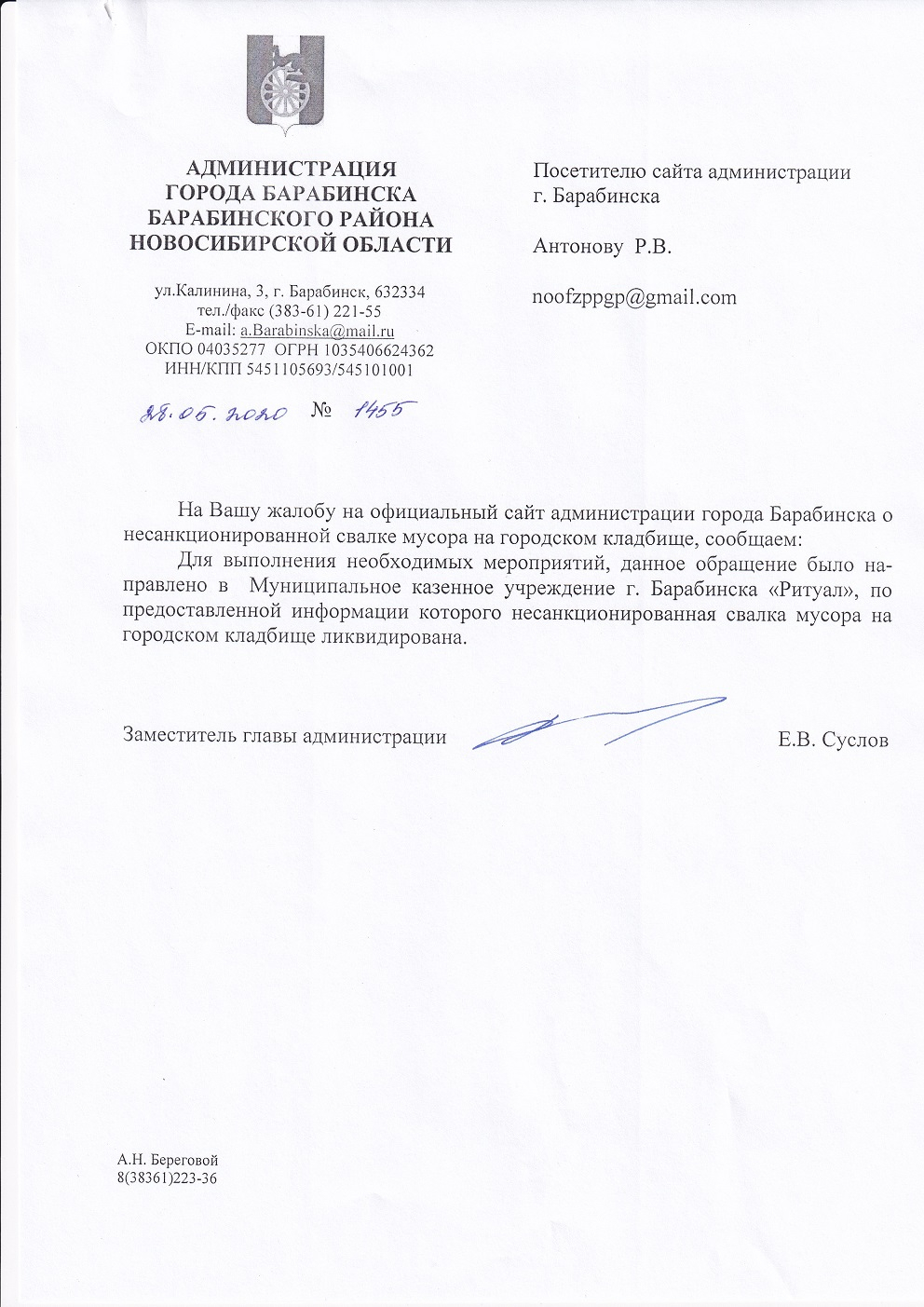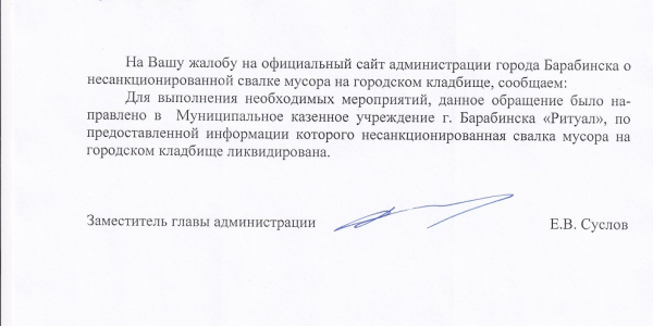 Номер жалобы:65978 Тип жалобы:Прочее Название объекта: Регион:Новосибирская область Город:Барабинск Адрес:Барабинск Описание жалобы:Кладбище в Барабинске захламлено. Много мусора. Статус: