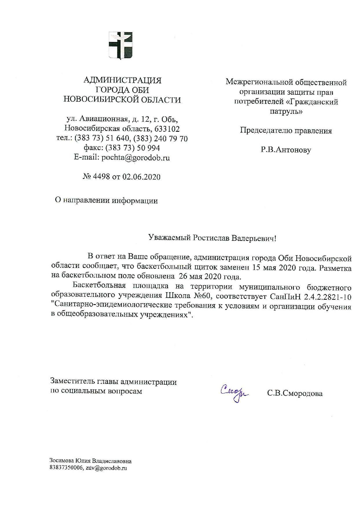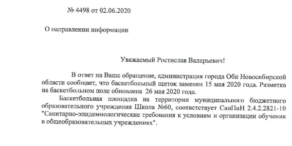 Номер жалобы:66025 Тип жалобы:Прочее Название объекта: Регион:Новосибирская область Город:Обь Адрес:улица ЖКО Аэропорта, 32 Описание жалобы:Баскетбольная площадка перед начальной школой номер 1 находится в плохом состояние. Разбитый щиток, отсутствие сетки, стёртая разметка - всё это препятствует развитию в городе Обь физической культуры и спорта. Прошу исправить выше указанные проблемы. Спасибо за понимание. Статус:
