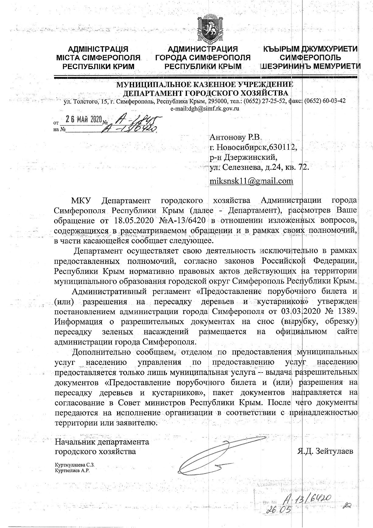 В границах города Симферополя ведётся бесконтрольная вырубка деревьев, в том числе снос аварийных деревьев, прошу предоставить информацию за 2019, 2020 г по данным работам: