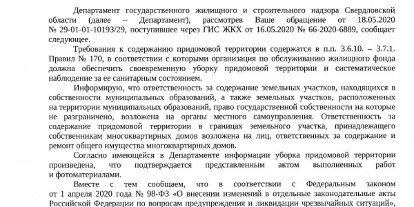 Номер жалобы:66001 Тип жалобы:Прочее Название объекта: Регион:Свердловская область Город:Екатеринбург Адрес:Советская улица, 6 Описание жалобы: ГИС ЖКХ Не производится уборка придомовой территории, много бутылок пустых, старые листья, ветки Статус: