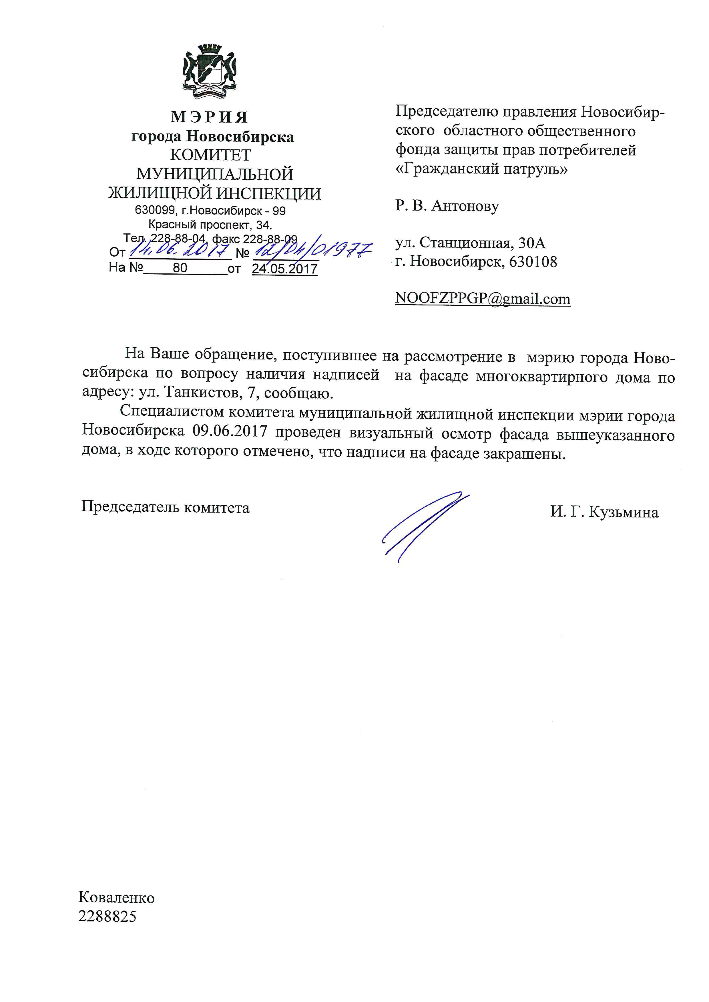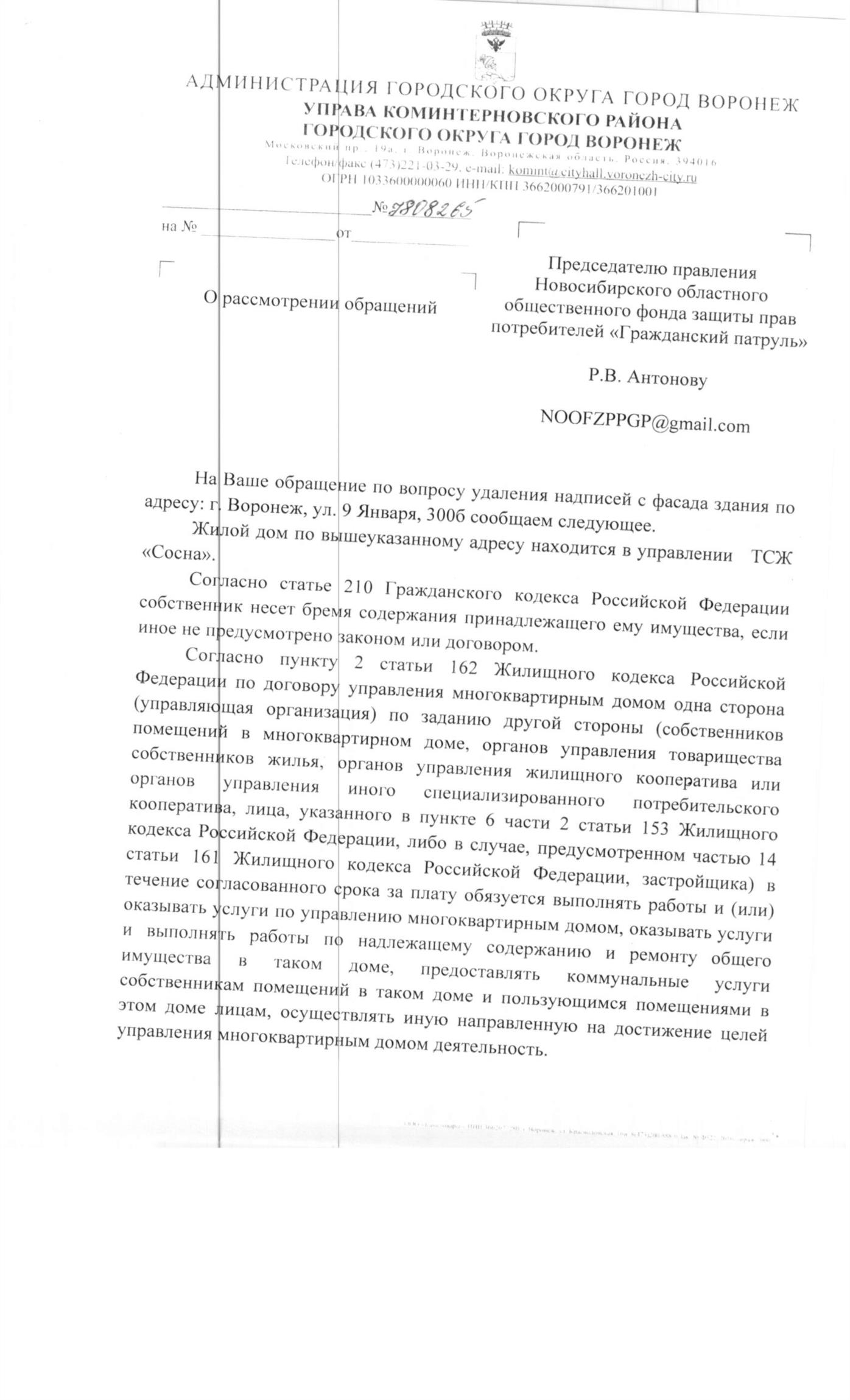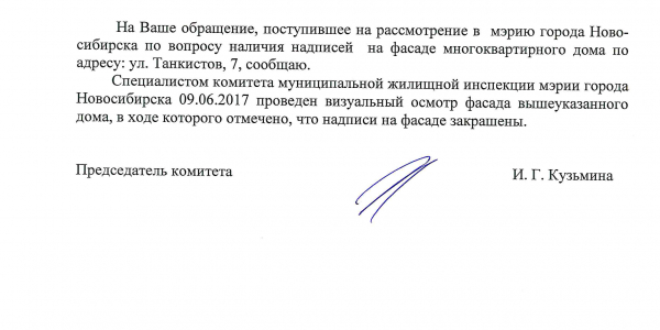 Номер жалобы:17873 Тип жалобы:Иные проблемы ЖКХ Название объекта:Жилой Дом Регион:Новосибирская область Город:Новосибирск Адрес:Красный пр., 49/7 Описание жалобы:Надписи на фасаде Статус: