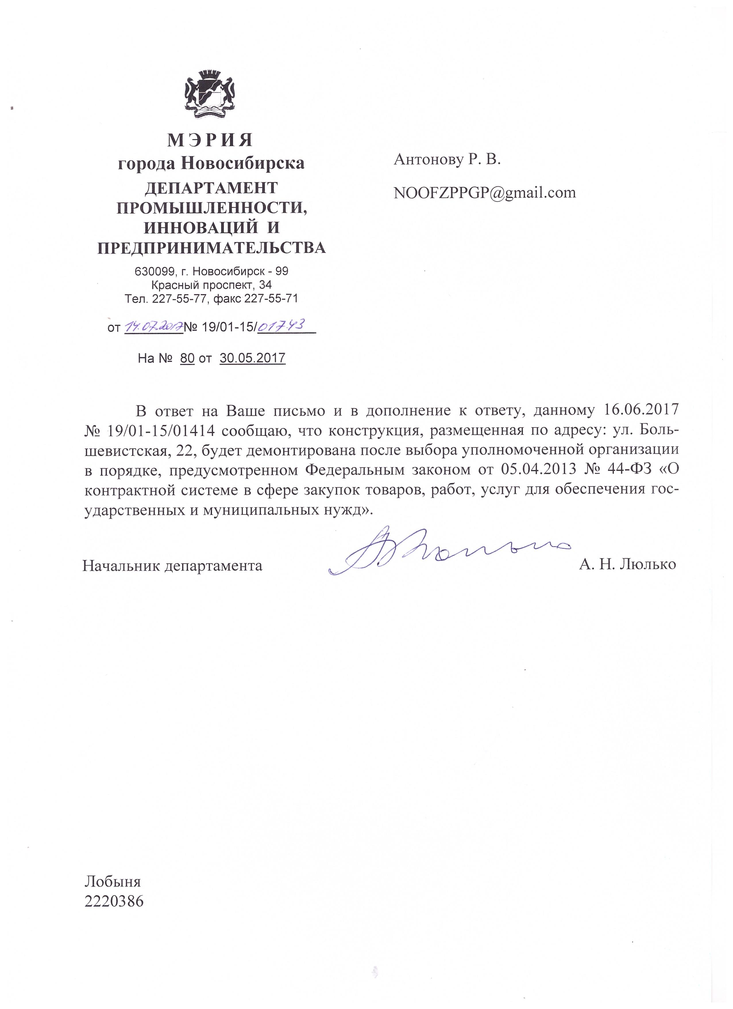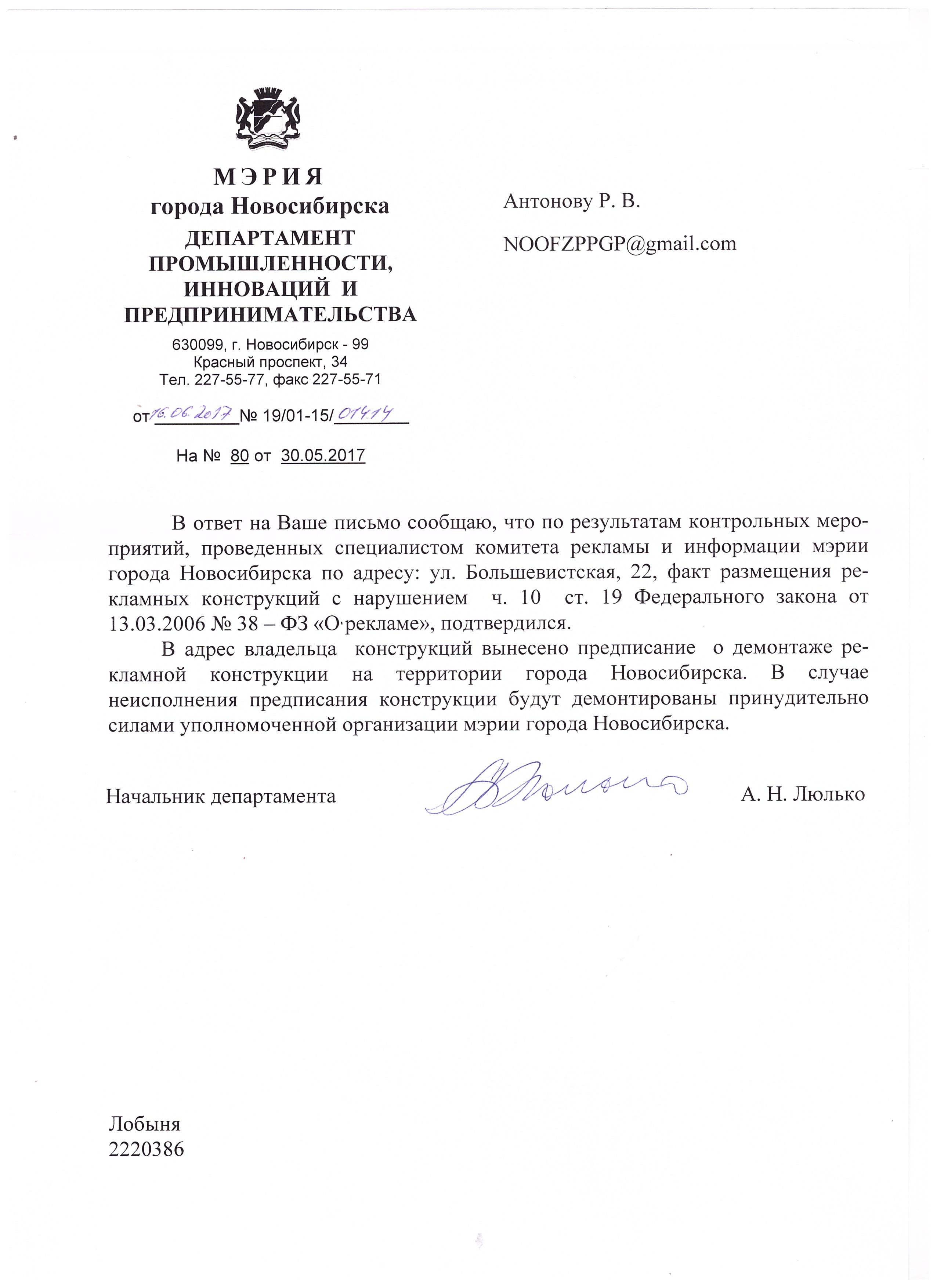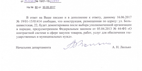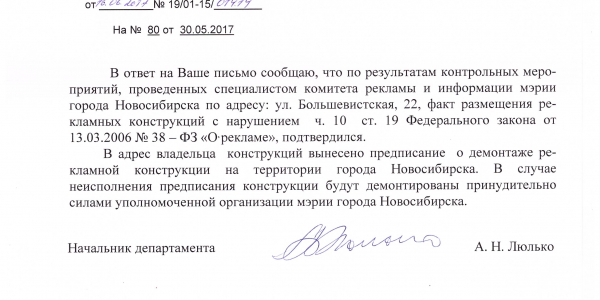 Номер жалобы:18106 Тип жалобы:Иные проблемы ЖКХ Название объекта:Жилой Дом Регион:Новосибирская область Город:Новосибирск Адрес:ул. Большевистская, 22 Описание жалобы:Незаконное размещение рекламной конструкции Статус:
