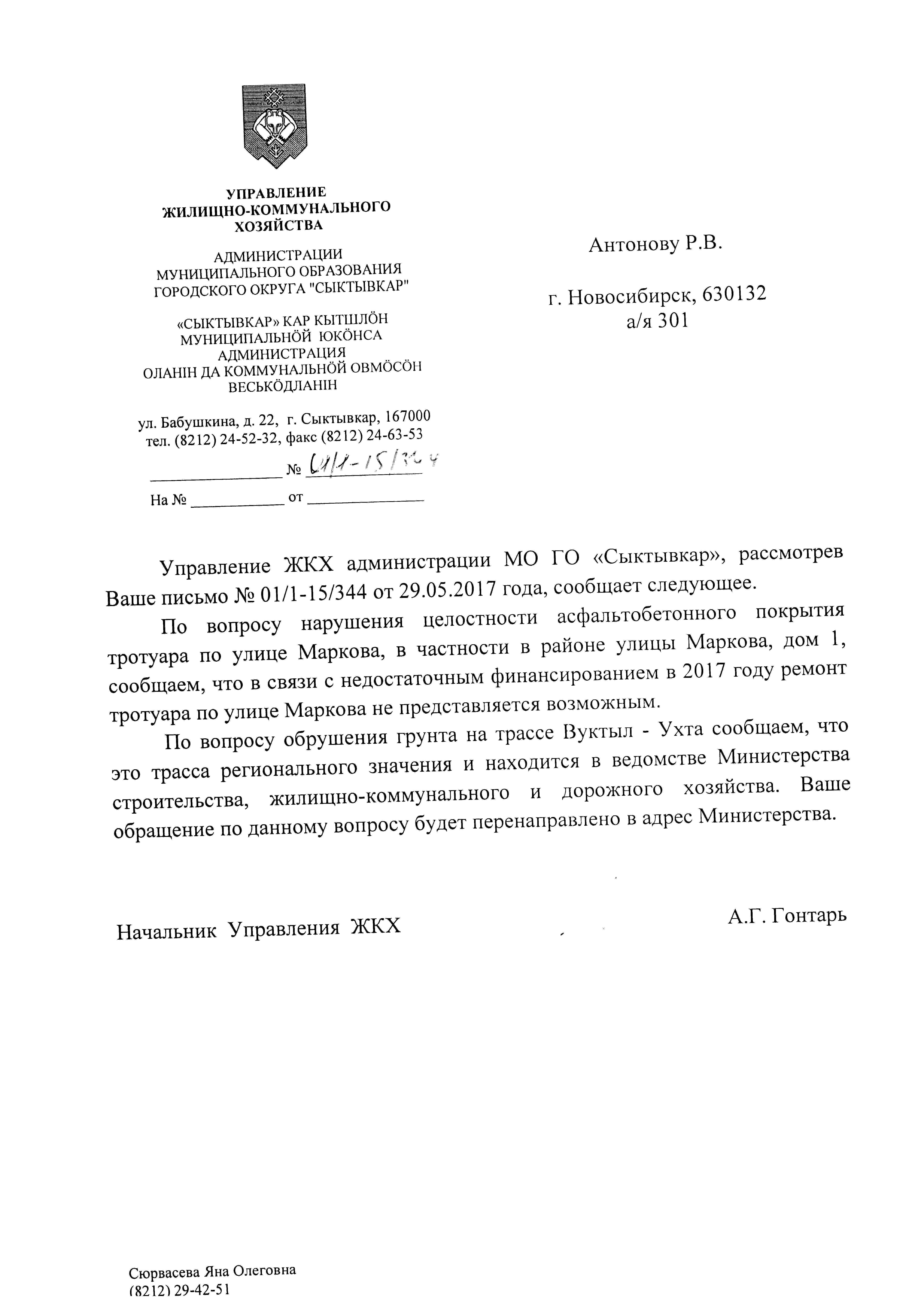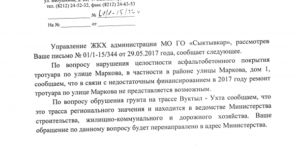 Номер жалобы:18126 Тип жалобы:Иные проблемы ЖКХ Название объекта:Гп В РК Город:Сыктывкар Адрес:Сыктывкар, улица Маркова, 1 Описание жалобы:Республика коми , город Печора . во дворе дома по улице железнодорожной 21 не огражденный люк Статус: