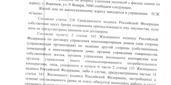 Номер жалобы:18033 Тип жалобы:Иные проблемы ЖКХ Название объекта:Ук Регион:Воронежская область Город:Воронеж Адрес:ул. 9-го Января, 300б Описание жалобы:Надписи на фасаде ж.д. Статус: