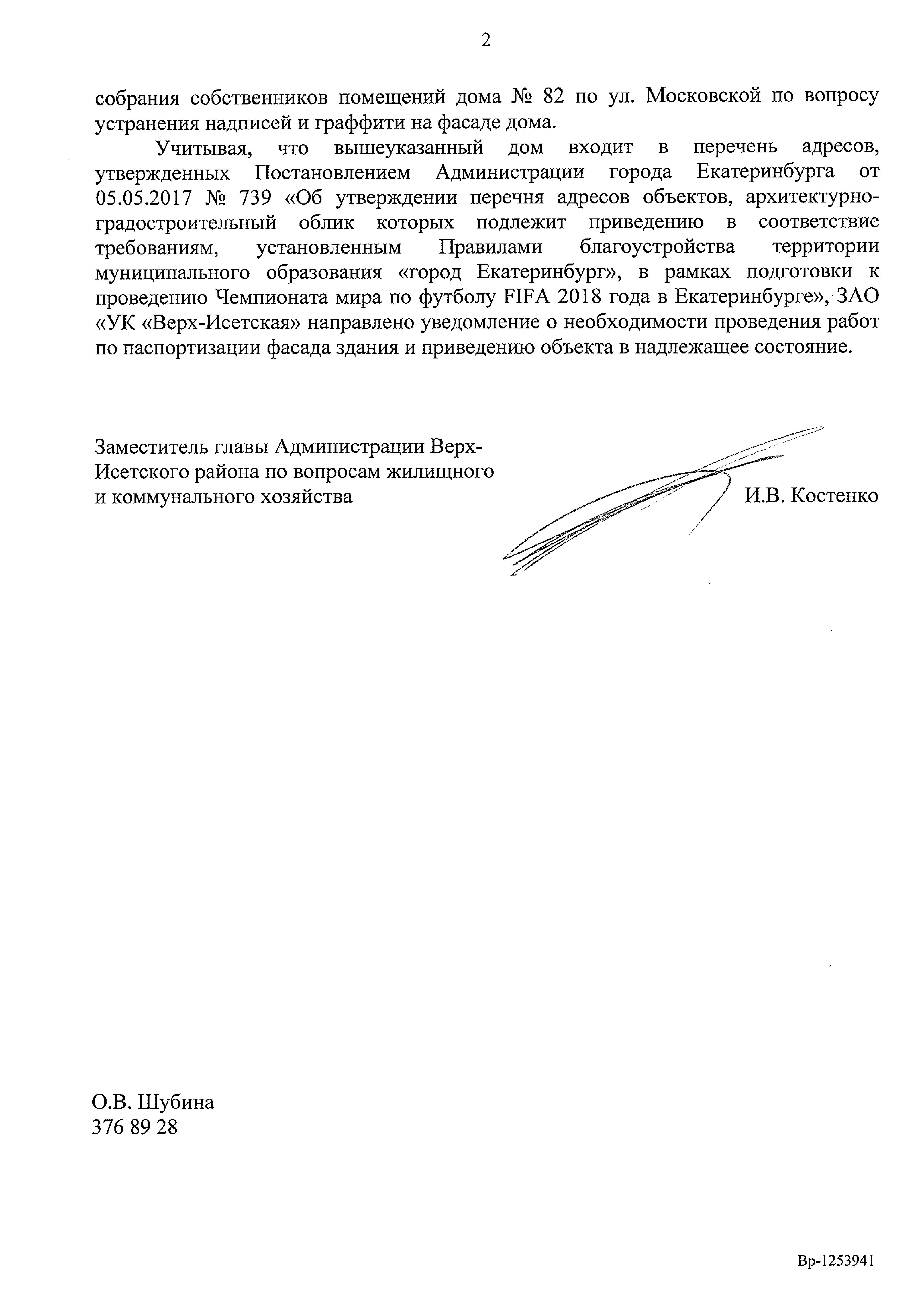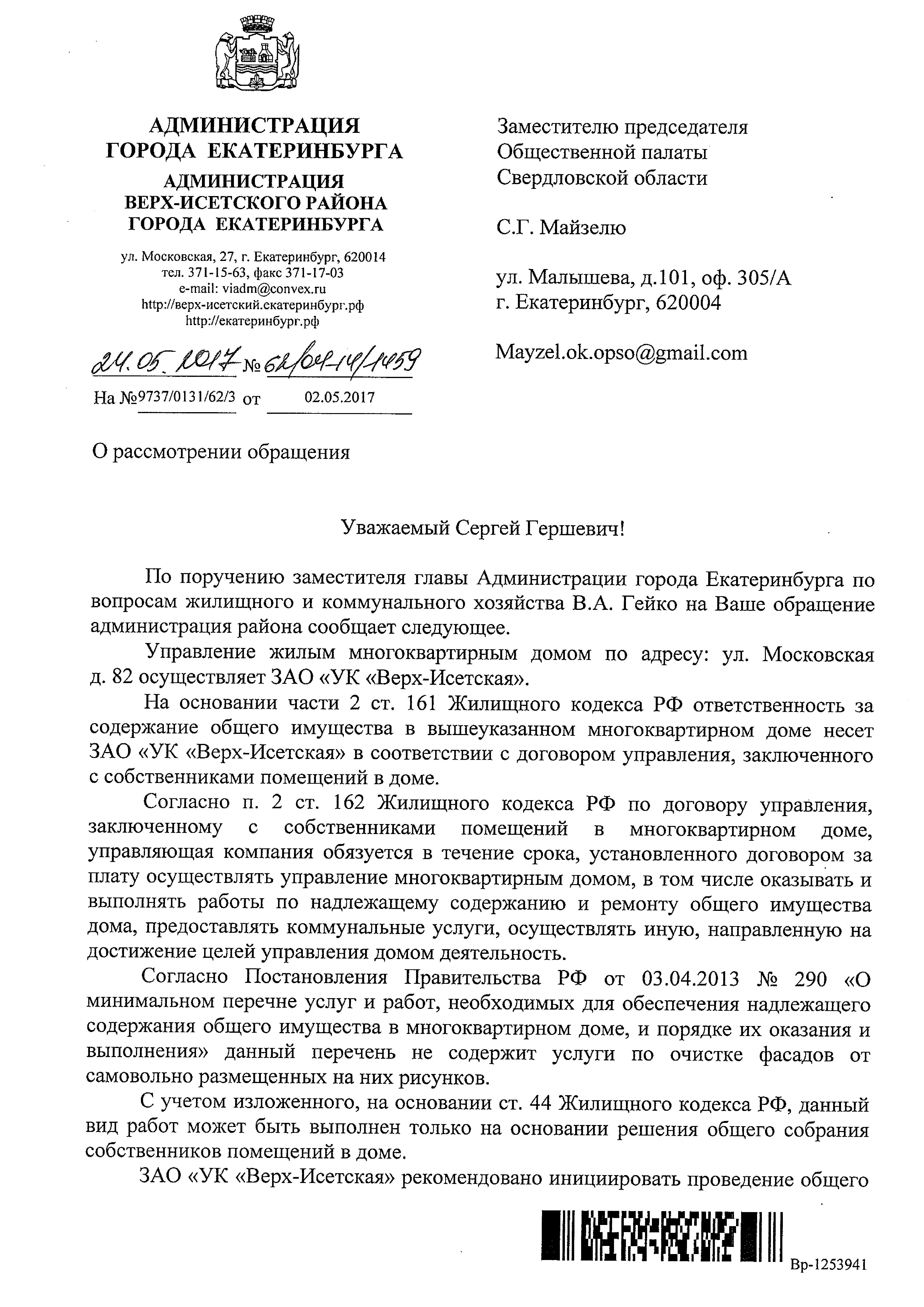 Номер жалобы:17140 Тип жалобы:Иные проблемы ЖКХ Название объекта:- Регион:Свердловская область Город:Екатеринбург Адрес:Московская улица, 82 Описание жалобы:Граффити на восточном фасаде дома. Статус: